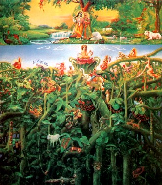 Verso 1 sri bhagavan uvaca Tradução O bem-aventurado Senhor disse: Existe uma figueira-sagrada que tem suas raízes para cima e seus galhos para baixo e cujas folhas são os hinos Védicos. Quem conhece essa árvore é o conhecedor dos Vedas. Iluminação de Srila Prabhupada: Depois da discussão sobre a importância de bhakti-yoga, alguém pode perguntar, "e sobre os Vedas"? Este capítulo explica que o propósito do estudo Védico é entender Krishna. Portanto, a pessoa que está em Consciência de Krishna, que está dedicada ao serviço devocional, já conhece os Vedas. O enredamento deste mundo material é comparado aqui a uma figueira-sagrada. Para a pessoa dedicada a atividades lucrativas, não existe fim da árvore. Ela vagueia de um galho a outro, até outro, e mais outro. A árvore deste mundo material não tem fim, e para a pessoa que é apegada a essa árvore, não existe possibilidade de liberação. Os hinos Védicos, destinados à elevação pessoal, são chamados de folhas dessa árvore. As raízes da árvore crescem para cima porque começam onde Brahma está localizado, o planeta mais alto deste universo. Se a pessoa conseguir entender essa árvore indestrutível da ilusão, então poderá sair dela. Esse processo de libertação tem que ser compreendido. Os capítulos anteriores explicaram que existem muitos processos com os quais se pode sair do enredamento material. E, até o Capítulo Treze, vimos que serviço devocional ao Supremo Senhor é o melhor caminho. Agora, o princípio básico do serviço devocional é desapego das atividades materiais e apego pelo serviço transcendental do Senhor. O processo de romper o apego pelo mundo material é discutido no início deste capítulo. A raiz desta existência material cresce para cima. Significa que começa na substância material total, do planeta mais alto do universo. De lá, todo o universo se expande, com muitos galhos, que representam os vários sistemas planetários. Os frutos representam os resultados das atividades dos seres vivos, a saber, religião, desenvolvimento econômico, desfrute sensual e liberação. Agora, não existe nenhuma experiência pronta neste mundo sobre uma árvore situada com seus galhos para baixo e sua raiz para cima, mas isso existe. Essa árvore pode ser encontrada à beira de um reservatório de água. Podemos ver que as árvores na margem refletem sobre a água com seus galhos para baixo e raízes para cima. Em outras palavras, a árvore deste mundo material é apenas um reflexo da árvore real do mundo espiritual. Esse reflexo do mundo espiritual está situado no desejo, do mesmo modo como o reflexo da árvore está situado sobre a água. Desejo é a causa das coisas estarem situadas nessa luz material refletida. A pessoa que deseja sair desta existência material tem que conhecer essa árvore inteiramente pelo estudo analítico. Então poderá cortar sua relação com ela. Essa árvore, como é o reflexo da árvore real, é uma réplica exata. Tudo existe lá no mundo espiritual. Os impersonalistas aceitam Brahma como a raiz dessa árvore material, e da raiz, segundo a filosofia Sankhya, vem prakriti, purusha, depois os três gunas, depois os cinco elementos grosseiros (pañcha-mahabhuta), depois os dez sentidos (dasendriya), mente etc.. Dessa forma, eles dividem o mundo material inteiro em vinte e quatro elementos. Se Brahma for o centro de todas manifestações, então este mundo material é uma manifestação do centro com 180 graus, e os outros 180 graus constituem o mundo espiritual. O mundo material é um reflexo pervertido, assim o mundo espiritual deve ter a mesma variedade, porém na realidade. Prakriti é a energia externa do Supremo Senhor, e purusha é o Supremo Senhor em pessoa, e isso é explicado no Bhagavad-gita. Como esta manifestação é material, é temporária. Um reflexo é temporário pois às vezes é visto e outras vezes não é visto. Mas a origem de onde o reflexo é refletido é eterna. O reflexo material da árvore tem que ser cortado. Quando se diz que uma pessoa conhece os Vedas, considera-se que ela sabe como cortar o apego por este mundo material. Se a pessoa sabe esse processo, conhece realmente os Vedas. A pessoa atraída às fórmulas ritualísticas dos Vedas tem atração pelas belas folhas verdes da árvore. Não conhece exatamente o propósito dos Vedas. O propósito dos Vedas, como revelado pessoalmente pela própria Personalidade de Deus, é cortar essa árvore refletida e alcançar a árvore real do mundo espiritual. Verso 2 adhas cordhvam prasrtas tasya sakha Tradução Os ramos dessa árvore se estendem para baixo e para cima, nutridos pelos três modos da natureza material. Os ramos são os objetos dos sentidos. Essa árvore também tem raízes que vão para baixo, as quais estão presas às ações lucrativas da sociedade humana. Iluminação de Srila Prabhupada: A descrição da figueira-sagrada é explicada mais ainda. Seus ramos se espalham em todas as direções. Nas partes inferiores, existem manifestações variadas de seres vivos como humanos, animais, cavalos, vacas, cães, gatos etc.. Todos situados nas partes mais baixas dos ramos, enquanto nas partes superiores ficam as formas elevadas de seres vivos: os semideuses, Gandharvas e muitas outras espécies de vida. Uma árvore é nutrida com água, assim essa árvore é nutrida com os três modos da natureza material. Algumas vezes, vemos que um pedaço de terra é árido por falta de água suficiente, e outras vezes, um terreno é bem verde; similarmente, onde os modos da natureza material são maiores proporcionalmente em quantidade, as diferentes espécies de vida se manifestam nessa proporção de acordo. Os ramos da árvore são considerados os objetos dos sentidos. Desenvolvemos diferentes sentidos pelos diferentes modos da natureza, e com o sentidos, desfrutamos diferentes variedades de objetos sensuais. A fonte dos sentidos; os ouvidos, as narinas, olhos etc.; é conside
