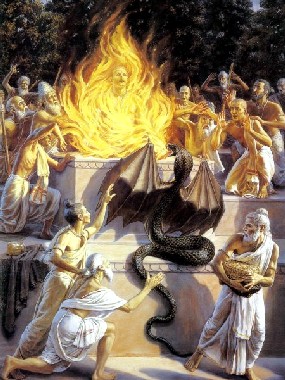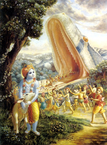 Quando o Senhor Krishna desfrutava Seus passatempos infantis com Seus amigos, um demônio Aghasura ficou muito impaciente. Ele não podia tolerar ver Krishna brincar, por isso apareceu diante dos meninos com a intenção de matar todos. Esse Aghasura era tão perigoso que até mesmo os habitantes do céu tinham medo dele. Apesar dos habitantes celestiais beberem néctar diariamente para prolongar suas vidas, tinham medo desse Aghasura e pensavam: "Quando o demônio vai ser morto"? Os seres celestiais costumam beber néctar para se tornarem imortais, mas na realidade, não confiam na sua imortalidade. Por outro lado, os meninos que brincavam com Krishna não tinham medo de demônios. Eles eram livres de medo. Quaisquer arranjos materiais para proteger-se da morte são sempre incertos, mas se a pessoa estiver em Consciência de Krishna, então a imortalidade está assegurada confiantemente. O demônio Aghasura apareceu na frente de Krishna e Seus amigos. Acontece que Aghasura era irmão mais novo de Putana e Bakasura, e ele pensou: "Krishna matou meu irmão e minha irmã. Agora vou matá-Lo junto de todos Seus amigos e bezerros". Aghasura foi instigado por Kamsa, por isso, vinha com determinação. Aghasura também começou a pensar que quando fosse oferecer grãos e água em memória de seu irmão e irmã e matar Krishna e todos os meninos pastores de vacas, então automaticamente todos os habitantes de Vrindavana também morreriam. Geralmente, para os familiares, as crianças são a vida e a força respiratória. Depois que todas crianças morressem, então naturalmente os pais também morreriam por causa da forte afeição por eles. Aghasura, após decidir dessa forma matar todos habitantes de Vrindavana, expandiu-se pelo yoga-siddhi chamado mahima. Os demônios geralmente são peritos em obterem quase todos os tipos de poderes místicos. No sistema de yoga, a perfeição chamada mahima-siddhi permite que a pessoa se expanda na forma que desejar. O demônio Aghasura se expandiu até treze quilômetros e assumiu a forma de uma serpente bem gorda. Ao assumir esse corpo espantoso, ele escancarou sua boca igual a uma caverna na montanha. Ele desejava engolir todos os meninos de uma vez, inclusive Krishna e Balarama, então parou no caminho. O demônio na forma de uma grande serpente gorda expandiu seus lábios da terra até o céu; seu lábio inferior tocava a terra e seu lábio superior tocava as nuvens. Sua mandíbula parecia uma grande caverna na montanha, sem iluminação, e seus dentes pareciam picos de montanhas. Sua língua parecia uma larga rodovia, e ele respirava igual a um furacão. O fogo de seus olhos era ardente. Primeiro, os meninos pensaram que o demônio era uma estátua, mas depois de examinar melhor, viram que era mais parecido com uma grande serpente deitada na estrada com a boca escancarada. Os meninos começaram a pensar entre eles: "Essa figura parece ser um grande animal, e ele está parado numa postura justamente para engolir todos nós. Olhem, não é uma grande serpente que escancarou sua boca para comer todos nós"? Um deles disse: "Sim, o que você disse é verdade. O lábio superior desse animal parece igual ao sol ardente, e seu lábio inferior é como o reflexo do sol avermelhado no chão. Caros amigos, apenas olhem para o lado direito e esquerdo da boca do animal. Sua boca parece ser como uma grande caverna na montanha, e sua altura não pode ser estimada. O queixo também é elevado igual ao pico de uma montanha. Aquela longa rodovia parece ser sua língua, e dentro da boca é tão escuro quanto dentro de uma caverna na montanha. O vento forte que sopra como um furacão é sua respiração, e o mau cheiro de peixe que sai de sua boca é o cheiro dos seus intestinos". Então eles consultaram mais entre si: "Se todos nós entrarmos ao mesmo tempo na boca dessa grande serpente, como será possível engolir todos nós? E mesmo se tiver que engolir todos nós de uma vez, não vai conseguir engolir Krishna. Krishna vai matá-lo imediatamente, como Ele fez com Bakasura". Falando dessa maneira, todos os meninos olharam para a bela face como o lótus de Krishna, e começaram a bater palmas e sorrir. E assim eles marcharam adiante e entraram na boca da serpente gigantesca. Entretanto, Krishna, que é a Superalma dentro do coração de todos, pôde entender que aquela grande figura monumental era um demônio. Enquanto Ele planejava como impedir a destruição de Seus amigos íntimos, todos os meninos junto com suas vacas e bezerros entraram na boca da serpente. Mas Krishna não entrou. O demônio esperava a entrada de Krishna, e pensava: "Todos entraram exceto Krishna, que matou meus irmãos e irmãs". Krishna é a garantia de segurança para todos. Mas quando viu que Seus amigos já estavam fora de Suas mãos e estavam deitados dentro do estômago de uma grande serpente, Ele ficou, momentaneamente, preocupado. Ele também ficou admirado de ver como a energia externa trabalha tão maravilhosamente. Então, Ele começou a considerar como o demônio devia ser morto e como Ele poderia salvar os meninos e os bezerros. Apesar de não haver nenhuma preocupação real da parte de Krishna, Ele pensava dessa forma. Finalmente, depois de um pouco de deliberação, Ele também entrou na boca do demônio. Quando Krishna entrou, todos os semideuses, que se reuniram para assistir à diversão e que estavam escondidos nas nuvens, começaram a expressar seus sentimentos com as palavras: "Ai de mi! Ai de mim"! Ao mesmo tempo, todos os amigos de Aghasura, especialmente Kamsa, que eram todos acostumados a comer carne e sangue, começaram a expressar seu júbilo, compreendendo que Krishna também tinha entrado na boca do demônio.