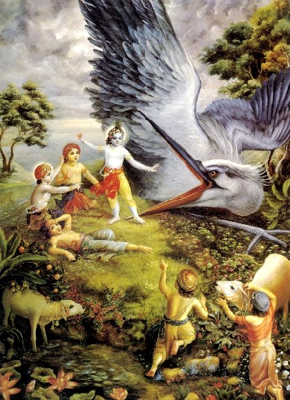 Quem pode descrever as donzelas de Vraja? Todas elas estavam sentadas nos carros e estavam muito bem vestidas com adereços e saris suntuosos. Elas começaram a cantar os passatempos da criança Krishna como de costume. Mãe Yashoda e mãe Rohini estavam sentadas em um carro separado, e Krishna e Balarama estavam sentados em seus colos. Enquanto as mães Rohini e Yashoda estavam no carro, falavam com Krishna e Balarama, e por sentir o prazer dessas conversas, elas ficaram muito, muito belas. Assim, quando chegaram a Vrindavana, onde todos vivem eternamente, com muita paz e felicidade, rodearam Vrindavana e mantiveram todos os carros juntos. Depois que viram a bela aparência de Govardhana na beira do rio Yamuna, começaram a construir seus locais de residência. Enquanto pessoas de mesma idade andavam juntas e crianças falavam com seus pais, os habitantes de Vrindavana se sentiram muito felizes. Nesse momento, Krishna e Balarama ficaram encarregados dos bezerros. A primeira responsabilidade dos meninos pastores de vacas era tomar conta dos bezerros pequenos. Os meninos são treinados dessa forma desde o começo de sua infância. Assim, junto com outros pequenos meninos pastores de vacas, Krishna e Balarama foram para o campo de pastagem, e tomaram conta dos bezerros e brincaram com Seus amiguinhos. Enquanto cuidavam dos bezerros, às vezes, os dois irmãos tocavam Suas flautas. E outras vezes Eles brincavam com frutas amalaka e frutas bael, do mesmo modo como crianças pequenas brincam com bolas. Outras vezes, Eles dançavam e faziam tinir Seus guizos de tornozelo. Às vezes, Eles Se faziam de touros e vacas por Se cobrirem com cobertores. Assim, Krishna e Balarama brincavam. Os dois irmãos também costumavam imitar os sons de touros e vacas e brincavam de tourada. Às vezes, Eles costumavam imitar os sons de vários animais e pássaros. Dessa forma, Eles desfrutavam de Seus passatempos de infância aparentemente como crianças mundanas comuns. Certa vez, quando Krishna e Balarama brincavam na margem do Yamuna, um demônio chamado Vatsasura assumiu a forma de bezerro e foi até lá com a intenção de matar os irmãos. Como assumiu a forma de um bezerro, o demônio pôde se misturar com os outros bezerros. Krishna, entretanto, notou isso especificamente, e Ele contou a Balarama imediatamente sobre a entrada do demônio. Os dois irmãos então o seguiram e o capturaram com astúcia. Krishna segurou o demônio bezerro pelas duas patas traseiras e rabo, sacudiu-o em volta severamente e o atirou em cima de uma árvore. O demônio perdeu sua vida e caiu de cima da árvore no chão. Quando o demônio caiu morto no chão, todos os amigos de Krishna O congratularam: "Bem feito, bem feito", e os semideuses no céu começaram a jogar chuvas de flores com grande satisfação. Dessa forma, os mantenedores da criação inteira, Krishna e Balarama, costumavam cuidar dos bezerros na manhã todos os dias, e assim Eles desfrutavam Seus passatempos infantis como meninos pastores de vacas em Vrindavana. Todos os meninos pastores de vacas iam diariamente à beira do rio Yamuna para dar de beber a Seus bezerros. Geralmente, quando os bezerros bebiam a água do Yamuna, os meninos também bebiam. Um dia, depois de beber, quando estavam sentados na margem do rio, eles viram um animal enorme que parecia algo como um pato e era grande como uma colina. Sua cabeça era forte como um raio. Quando viram esse animal incomum, ficaram com medo dele. O nome dessa fera era Bakasura, e ele era amigo de Kamsa. Ele apareceu na cena de repente e imediatamente atacou Krishna com seu bico pontudo e afiado, e O engoliu rapidamente. Quando Krishna foi engolido dessa forma, todos os meninos, liderados por Balarama, ficaram quase sem respiração, como se tivessem morrido. Mas enquanto o demônio Bakasura engolia Krishna, sentiu uma sensação de fogo ardente em sua garganta. Isso foi por causa do esplendor do brilho de Krishna. O demônio expeliu Krishna rapidamente e tentou matá-Lo por bicá-Lo com seu bico. Bakasura não sabia que apesar de Krishna fazer o papel de um filho de Nanda Maharaja, mesmo assim Ele ainda é o pai original do Senhor Brahma, o criador do universo. O filho de mãe Yashoda, que é o reservatório de prazer de todos os semideuses e que é o mantenedor das pessoas santificadas, pegou nos bicos do grande pato gigantesco, e, na frente de Seus amigos meninos pastores de vacas, bifurcou a boca dele, da mesma forma como uma criança pequena bifurca uma folha de grama. Do céu, os habitantes dos planetas celestiais jogaram chuvas de flores como a cameli, a mais fragrante de todas as flores, como um sinal de suas congratulações. Acompanhava a chuva de flores, uma vibração de clarins, tambores e búzios.
