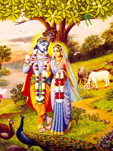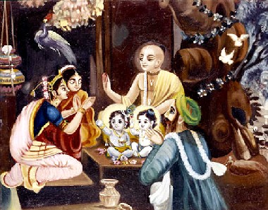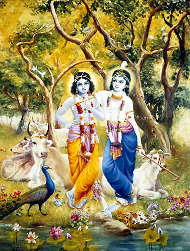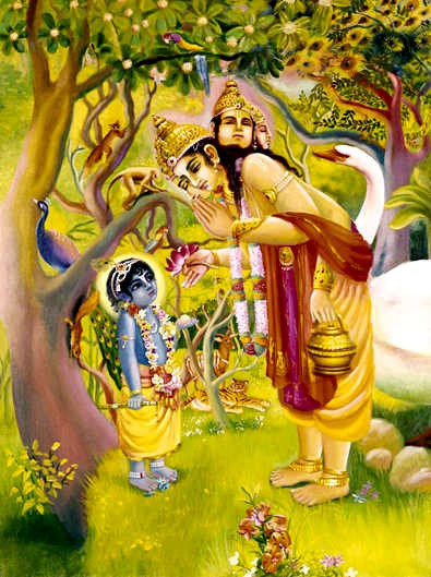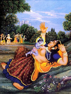 Quando o melhor dos Vasus chamado Drona junto com sua esposa Dhara foram ordenados pelo Senhor Brahma para incrementarem a progênie, disseram a ele: "Querido pai, buscamos sua bênção". Drona e Dhara pediram a bênção de Brahma para que no futuro; quando nascessem novamente no universo; o Supremo Senhor Krishna em Seu aspecto infantil mais atraente absorvesse toda a atenção deles. Seu relacionamento com Krishna seria tão poderoso que simplesmente por ouvir as atividades infantis de Krishna com eles, qualquer um poderia superar facilmente a ignorância do nascimento e morte. O Senhor Brahma concordou em conceder a eles essa bênção, e como resultado o mesmo Drona apareceu como Nanda Maharaja em Vrindavana, e a mesma Dhara apareceu como mãe Yashoda, a esposa de Nanda Maharaja. Assim, Nanda Maharaja e sua esposa, mãe Yashoda, desenvolveram sua devoção imaculada pela Suprema Personalidade de Deus, ao obtê-Lo como seu filho. E todas as gopis e pastores de vacas que eram companheiros de Krishna desenvolveram naturalmente seus próprios sentimentos de amor por Krishna. Portanto, justamente para cumprir a bênção do Senhor Brahma, o Senhor Krishna apareceu junto com Sua expansão plenária, Balarama, e realizou todos tipos de passatempos infantis a fim de incrementar o prazer transcendental de todos residentes de Vrindavana.