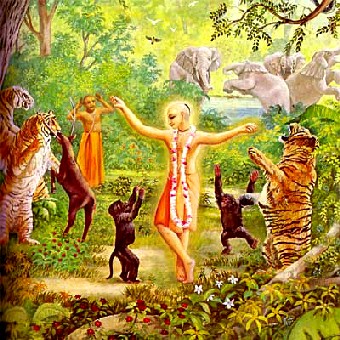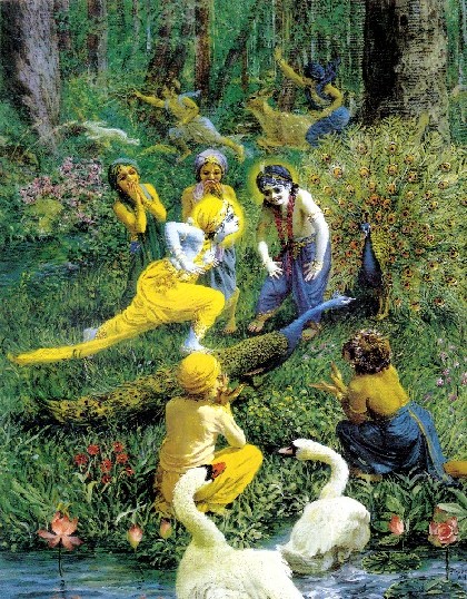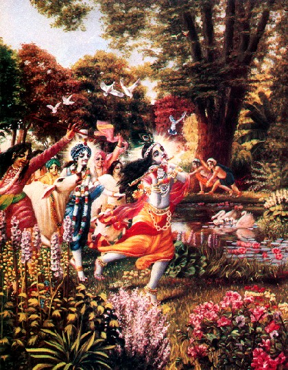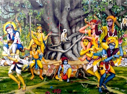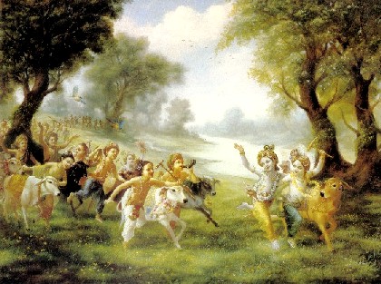 Quando o Senhor Krishna ia adiante até um local distante a fim de ver algum cenário específico, os meninos atrás Dele tentavam correr e alcançá-Lo para ser o primeiro a tocá-Lo. Assim, havia uma grande competição. Um dizia, "eu vou lá e tocarei Krishna", e outro dizia, "ó, você não pode ir. Eu vou tocar Krishna primeiro". Alguns deles tocavam suas flautas ou vibravam seus clarins feitos de chifre de búfalo. Alguns deles seguiam os pavões alegremente e imitavam os sons onomatopéicos do cuco. Enquanto os pássaros voavam no céu, os meninos corriam atrás das sombras dos pássaros no chão e tentavam seguir o curso exato deles. Alguns deles iam para junto dos macacos e se sentavam em silêncio ao lado deles, e alguns deles imitavam a dança dos pavões. Alguns deles pegavam no rabo dos macacos e brincavam com eles, e quando os macacos pulavam numa árvore os meninos também os seguiam. Quando um macaco fazia careta e mostrava os dentes, um menino imitava e mostrava seus dentes para o macaco. Alguns dos meninos brincavam com as rãs na margem do Yamuna, e quando, por medo, as rãs pulavam na água, os meninos mergulhavam atrás delas imediatamente, e saíam da água depois que viam suas próprias sombras e de pé, faziam imitações, faziam caricaturas e riam. Eles iam até um poço seco e gritavam bem alto, e quando o eco voltava, eles diziam palavras de insulto e davam risada.
