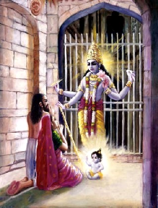 Vasudeva viu aquela criança maravilhosa nascer como um bebê com quatro mãos, que seguravam búzio, maça, disco e flor de lótus, decorada com a marca de Srivatsa, com o colar de jóias da pedra kaustubha, vestida com seda amarela, de aparência fascinante como uma nuvem negra brilhante, com um elmo cravejado com a pedra vaidurya, valiosos braceletes, brincos e outros ornamentos similares por todo Seu corpo, e cabelo abundante em Sua cabeça. Por causa das características extraordinárias da criança, Vasudeva ficou admirado. Como um bebê recém-nascido podia estar decorado daquela forma? Ele pôde entender então que o Senhor Krishna tinha aparecido, e ficou extasiado com a ocasião. Vasudeva com muita humildade ponderou que apesar de ser um ser vivo ordinário condicionado pela natureza material e de estar externamente preso por Kamsa, a Personalidade de Deus todo-penetrante, Vishnu ou Krishna, apareceu como uma criança em seu lar, exatamente em Sua posição original. Nenhuma criança terrestre nasce com quatro mãos, decorada com ornamentos e belas roupas, plenamente equipada com todos os sinais da Suprema Personalidade de Deus. Uma e outra vez, Vasudeva olhava para a criança, e considerou como celebrar esse momento auspicioso, ele pensou: "Geralmente, quando uma criança masculina nasce, as pessoas observam a ocasião com celebrações jubilosas, e no meu lar, apesar de eu estar preso, a Suprema Personalidade de Deus nasceu. Quantos muitos milhões e milhões de vezes devo estar preparado para observar esta cerimônia auspiciosa"!