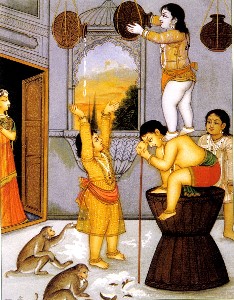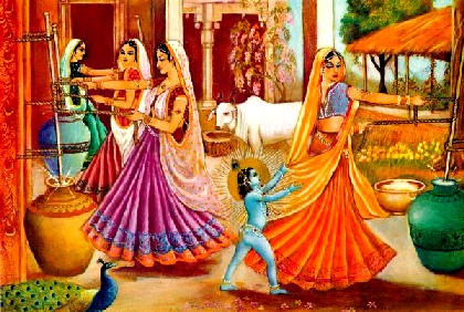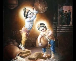 Depois de ouvir isso, Yashoda dizia: "Tudo bem, vou tirar as jóias de Krishna para que Ele não possa ver a manteiga escondida no escuro". Então as gopis diziam: "Não, não, não faça isso. Qual a vantagem de tirar as jóias? Nós não sabemos que tipo de meninos Eles são, e mesmo sem adereços, Eles irradiam um tipo de refulgência que Os faz ver tudo mesmo no escuro". Então, mãe Yashoda as avisava: "Tudo bem, guardem sua manteiga e iogurte cuidadosamente para que Eles não encontrem". Em resposta, as gopis diziam: "Sim, faremos isso com certeza, mas às vezes estamos ocupadas em nossos deveres domésticos e esses meninos levados entram em nossas casas e de algum jeito, bagunçam tudo. Às vezes, quando não conseguem furtar nossa manteiga e iogurte, ficam com raiva e urinam no nosso chão limpo e às vezes cospem. Veja seu menino agora; Ele está ouvindo esta reclamação. O dia inteiro, Eles simplesmente dão um jeito de furtar nossa manteiga e iogurte, e agora estão sentados em silêncio exatamente como bons meninos. Veja o rosto Deles". Quando mãe Yashoda pensava em castigar seu menino depois de ouvir todas as reclamações, olhava para Seu rosto arrependido, sorria e não O castigava.