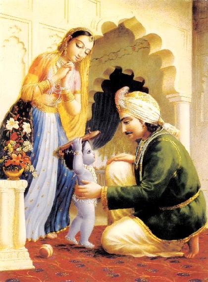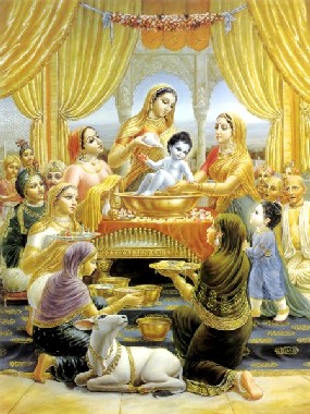 Apesar de Krishna ser filho verdadeiro de Vasudeva e Devaki, por causa das atividades atrozes de Kamsa, Vasudeva não pôde desfrutar da cerimônia de nascimento de seu filho. Mas Nanda Maharaja, o pai adotivo, celebrou a cerimônia de nascimento de Krishna muito alegremente. No dia seguinte, foi declarado que um filho homem nasceu de Yashoda. De acordo com o costume Védico, Nanda Maharaja chamou astrólogos e brahmanas eruditos para realizarem a cerimônia de nascimento. Depois do nascimento de um filho, os astrólogos calculam o momento do nascimento e fazem um horóscopo da vida futura da criança. Outra cerimônia acontece depois do nascimento do filho: os membros da família tomam banhos, purificam-se e se decoram com adereços e colares de flores; depois ficam em frente à criança e ao astrólogo para ouvir sobre a vida futura do filho. Nanda Maharaja e outros membros da família se vestiram e sentaram em frente ao local do nascimento. Todos os brahmanas que estavam reunidos ali para a ocasião cantaram mantras auspiciosos, de acordo com os rituais, enquanto os astrólogos realizavam a cerimônia do nascimento. Todos os semideuses também são adorados nessa ocasião, e também os antepassados da família. Nanda Maharaja distribuiu 200.000 vacas muito bem decoradas, vestidas e ornamentadas para os brahmanas. Ele não deu apenas vacas em caridade, mas montes de cereais, decorados com panos bordados com ouro e muitos adornos. No mundo material, possuímos riqueza e fortuna de várias formas, mas às vezes de forma não muito honesta e piedosa, porque assim é a natureza do acumulo de riqueza. Segundo a lei Védica, portanto, essa riqueza deve ser purificada com a doação de vacas e ouro em caridade aos brahmanas. Devemos entender que neste mundo material sempre vivemos num estado contaminado. Por isso que devemos purificar a duração de nossas vidas, nossas posses de riqueza e nós mesmos. A duração de vida é purificada ao tomar banho diariamente, com a limpeza do corpo interna e externa e por aceitar os dez tipos de processos purificatórios. Com austeridades, adoração ao Senhor, e com a distribuição de caridade, podemos purificar a posse de riqueza. Podemos nos purificar com o estudo dos Vedas, com o empenho para a auto-realização e com o entendimento sobre a Verdade Absoluta Suprema. Assim, a literatura Védica afirma que todo mundo nasce como um shudra, e ao aceitar o processo purificatório, a pessoa se torna nascida duas vezes (segundo nascimento). Com o estudo dos Vedas, a pessoa pode se tornar um vipra, que é a qualificação preliminar para se tornar um brahmana. Quando a pessoa entende a Verdade Absoluta com perfeição, é chamada brahmana. E quando o brahmana alcança a perfeição ulterior, torna-se um Vaishnava ou um devoto. Nessa cerimônia, todos os brahmanas reunidos começaram a cantar diferentes tipos de mantras Védicos para invocar toda boa fortuna para a criança. Existem diferentes tipos de cantos de mantras, conhecidos como suta, magadha, vandija e virudavali. Junto com esse canto dos mantras e canções, soavam clarins e címbalos do lado de fora da casa. Nessa ocasião, as vibrações jubilosas podiam ser ouvidas em todos campos de pastagem e em todas casas. Dentro e fora das casas, havia variedades de pinturas artísticas, feitas com polpa de arroz, e água perfumada era borrifada em toda parte, mesmo nas estradas e ruas. Tetos e telhados estavam decorados com vários tipos de bandeiras, coroas de flores e folhas verdes. Os portões eram feitos com folhas verdes e flores. Todas as vacas, touros e bezerros eram ungidos com uma mistura de óleo e açafrão, e pintados com minerais como óxido vermelho, argila amarela e manganês. Usavam colares de penas de pavão e eram cobertos com belos panos coloridos e colares de ouro. Quando todos pastores de vacas em êxtase souberam que Nanda Maharaja, pai de Krishna, celebrava a cerimônia de nascimento do seu filho, ficaram extremamente felizes. Eles se vestiram com roupas preciosas, enfeitaram seus corpos com vários tipos de brincos e colares e usavam grandes turbantes em suas cabeças. Depois de se vestirem dessa forma deslumbrante, levaram vários tipos de presentes e chegaram à casa de Nanda Maharaja. Ao saberem que mãe Yashoda tinha dado à luz um filho, todas as pastoras de vacas ficaram dominadas pela felicidade, e também se vestiram com vários tipos de roupas e adereços preciosos, e ungiram seus corpos com cosméticos perfumados. Do mesmo modo como a poeira sobre a flor de lótus exibe a beleza primorosa da flor, todas as gopis (meninas pastoras de vacas) aplicaram pó de açafrão em suas faces que eram como a flor de lótus. Essas lindas gopis levaram vários presentes e logo chegaram à casa de Maharaja Nanda. Sobrecarregadas com suas ancas pesadas e seios inchados, as gopis não conseguiam ir muito rápido para a casa de Nanda Maharaja, mas por causa do amor extático por Krishna, começaram a andar o mais rápido possível. Suas orelhas estavam decoradas com brincos de pérola, e suas golas decoradas com broches de jóias, seus lábios e olhos decorados com vários tipos de batons e sombras, e suas mãos decoradas com belos braceletes de ouro. À medida que seguiam apressadamente pela estrada de pedra, os colares de flores que decoravam seus corpos caíam no chão, e fazia parecer que uma chuva de flores caía do céu. Com o movimento dos vários tipos de adereços em seus corpos, ficavam ainda mais belas. Dessa forma, todas elas chegaram à casa de Nanda-Yashoda e abençoaram a criança: "Querida criança, viva muito justamente para nos proteger". Enquanto abençoavam o bebê Krishna dessa forma, ofereceram uma mistura de pó de açafrão com óleo, iogurte, leite e água. Elas não só borrifaram essa mistura no corpo do bebê Krishna mas também em todas pessoas que estavam presentes ali. Também nessa ocasião auspiciosa, havia várias bandas com músicos virtuosos que tocavam. Qu