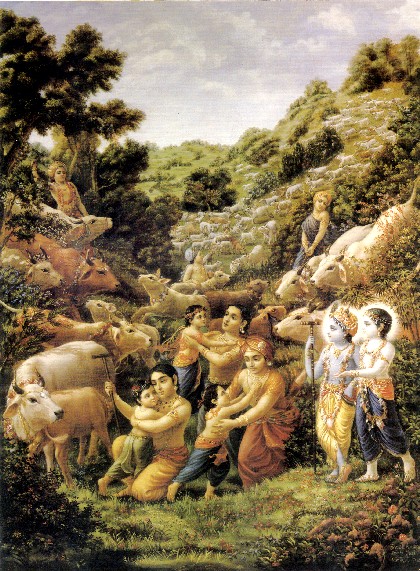No momento quando Aghasura foi morto e os semideuses assistiam ao incidente com grande espanto, Brahma, que nasceu da flor de lótus que cresce do umbigo de Vishnu, também veio ver. Ele ficou surpreso de ver como o menino pequeno Krishna pode agir tão maravilhosamente. Apesar de ser informado que aquele pequeno menino pastor de vacas era a Suprema Personalidade de Deus, ele queria ver mais passatempos glorificados do Senhor, e por isso roubou todos os bezerros e meninos pastores de vacas e levou-os todos para um local diferente. Assim, o Senhor Krishna, apesar de procurar pelos bezerros, não conseguiu encontrá-los, e Ele perdeu até mesmo Seus amiguinhos na margem do Yamuna onde tomavam seu lanche. Na forma de um menino pastor de vacas, o Senhor Krishna era muito pequeno em comparação com Brahma, mas porque Ele é a Suprema Personalidade de Deus, Ele pôde entender imediatamente que todos os bezerros e meninos foram roubados por Brahma. Krishna pensou: "Brahma levou embora todos os meninos e bezerros. Como posso voltar para Vrindavana sozinho? As mães vão ficar aflitas"! Por isso, para satisfazer as mães de Seus amiguinhos bem como convencer Brahma sobre a supremacia da Personalidade de Deus, Ele imediatamente Se expandiu como os meninos pastores de vacas e os bezerros. Os Vedas afirmam que a Suprema Personalidade de Deus expandiu-Se em tantos seres vivos por meio de Sua energia. Por isso que não foi difícil para Ele Se expandir novamente em tantos meninos e bezerros. Ele Se expandiu para ficar exatamente igual aos meninos, que eram de diferentes características de constituição facial e corpórea, e que eram diferentes em suas roupas e ornamentos e seu comportamento e atividades pessoais. Em outras palavras, cada um tem gostos diferentes; por ser uma alma individual, cada pessoa tem atividades e comportamento inteiramente diferentes. Mesmo assim, Krishna Se expandiu exatamente em todas as posições diferentes dos meninos individuais. Ele também Se tornou os bezerros, que também eram de diferentes tamanhos, cores, atividades, etc.. Isso foi possível porque tudo é uma expansão da energia de Krishna. É dito no Vishnu Purana, parasya brahmanah saktih. Qualquer coisa que vemos realmente na manifestação cósmica; seja matéria ou as atividades dos seres vivos; é simplesmente uma expansão das energias do Senhor, da mesma forma como calor e luz são diferentes expansões do fogo. Assim Se expandindo como os meninos e os bezerros em suas capacidades individuais, e rodeado pelas expansões Dele mesmo, Krishna entrou na vila de Vrindavana. Os residentes não tinham conhecimento sobre o que tinha acontecido. Depois de entrar na vila, Vrindavana, todos os bezerros entraram em seus estábulos, e os meninos também foram para suas respectivas mães e lares. As mães dos meninos ouviam a vibração de suas flautas antes de sua entrada, e para recebê-los, elas saíam de suas casas e os abraçavam. E por afeição maternal, o leite escorria de seus seios, e elas deixavam os meninos mamarem. Porém, a oferenda delas não era exatamente para seus meninos e sim para a Suprema Personalidade de Deus, que Se expandiu nesses meninos. Essa foi uma chance para todas as mães de Vrindavana alimentarem a Suprema Personalidade de Deus com seu próprio leite. Dessa forma, o Senhor Krishna não deu a chance de alimentá-Lo somente a Yashoda, mas dessa vez, Ele deu a chance a todas as gopis adultas. Todos os meninos começaram a lidar com suas mães como de costume, e as mães também, com a aproximação da noite, começavam a banhar seus filhos respectivos, decorá-los com tilaka e ornamentos e dar a eles a comida necessária depois do labor do dia. As vacas também, que estavam longe no campo de pastagem, voltavam à noitinha e começavam a chamar seus bezerros respectivos. Os bezerros vinham imediatamente para suas mães, e as mães começavam a lamber os corpos dos bezerros. Essas relações entre vacas e as gopis com seus bezerros e meninos permaneceram inalteradas, apesar de na realidade os bezerros e meninos originais não estarem ali. Na verdade, a afeição das vacas por seus bezerros e a afeição das gopis adultas por seus meninos aumentou por acaso. Sua afeição incrementou naturalmente, mesmo se os bezerros e meninos não eram sua prole. Apesar das vacas e gopis adultas de Vrindavana terem mais afeição por Krishna do que por seus próprios filhos, depois desse incidente, sua afeição por seus filhos incrementou ilimitadamente, exatamente como era por Krishna. Por um ano continuamente, Krishna em pessoa Se expandiu nos bezerros e meninos pastores de vacas e estava presente no campo de pastagem. Como o Bhagavad-gita afirma, a expansão de Krishna está presente no coração de todos na forma da Superalma. Similarmente, em vez de Se expandir como a Superalma, Ele Se expandiu numa porção de bezerros e meninos pastores de vacas durante um ano contínuo. Um dia, quando Krishna, junto com Balarama, cuidavam dos bezerros na floresta, Eles viram algumas vacas que pastavam no topo da colina Govardhana. As vacas puderam ver lá em baixo no vale onde os bezerros eram cuidados pelos meninos. De repente, ao verem seus bezerros, as vacas começaram a correr em direção a eles. Elas se lançaram montanha abaixo com as patas dianteiras combinadas com as traseiras. As vacas estavam tão enternecidas com afeição por seus bezerros que não se importavam sobre o caminho acidentado do topo da colina Govardhana até em baixo no campo de pastagem. Elas começaram a se aproximar de seus bezerros com seus úberes cheios de leite e elas levantavam seus rabos para cima. Quando elas desceram a montanha, suas tetas jorravam leite no chão por causa da afeição maternal intensa pelos bezerros, apesar de não serem seus próprios bezerros. Essas vacas tinham seus próprios bezerros, e os bezerros que pastavam em baixo da colina Govardhana eram maiores; eles não deveriam mamar o leite diretamente das t