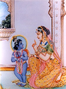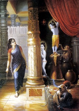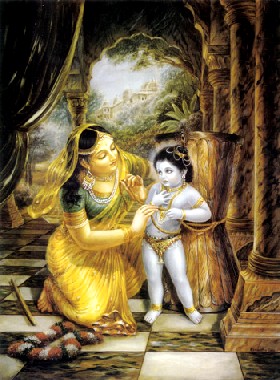 Certa vez, ao ver que sua ajudante estava ocupada em vários deveres domésticos, mãe Yashoda se encarregou de bater a manteiga pessoalmente. Enquanto batia a manteiga, cantava os passatempos infantis de Krishna e desfrutava com o pensamento absorto em seu filho. A parte inferior de seu sári estava bem apertada enquanto batia, e por causa do amor intenso por seu filho, o leite escorria de seus seios que se moviam à medida que trabalhava arduamente, ao bater com as duas mãos. As pulseiras e braceletes em suas mãos tilintavam à medida que batiam entre si, e seus brincos e seios sacudiam. Havia gotas de suor em sua face, e a grinalda que estava em sua cabeça se espalhou por todos os lados. Nessa cena pitoresca, o Senhor Krishna apareceu como uma criança. Ele sentiu fome, e por causa do amor por Sua mãe, queria que ela parasse de bater a manteiga. Ele indicou que a primeira obrigação dela era deixá-Lo mamar em seu seio, e depois bater a manteiga mais tarde. Mãe Yashoda pegou seu filho no colo e pôs o bico de seu seio na boca Dele, e enquanto Krishna mamava seu leite, ela sorria, e desfrutava a beleza da face de seu filho. De repente, o leite que estava no fogão começou a ferver. Então, para impedir que o leite derramasse, mãe Yashoda pôs Krishna de lado imediatamente e foi até o fogão. Deixado desse jeito por Sua mãe, Krishna ficou bravo, e Seus lábios e olhos ficaram vermelhos de raiva. Ele apertou Seus dentes e lábios, pegou um pedaço de pedra e imediatamente quebrou o pote de manteiga. Ele pegou um pouco da manteiga, e com lágrimas falsas em Seus olhos, começou a comer a manteiga num lugar escondido. Então, mãe Yashoda voltou ao local de bater manteiga depois de pôr em ordem a panela de leite que transbordava. Ela viu o pote quebrado, no qual ficava o iogurte batido. Como não conseguiu achar seu menino, concluiu que o pote quebrado foi arte Dele. Ela começou a sorrir enquanto pensava: "O menino é muito esperto. Depois de quebrar o pote, Ele saiu daqui com medo do castigo". Depois de procurar em toda parte, ela encontrou um grande pilão de madeira que era guardado de cabeça para baixo, e viu seu filho sentado em cima dele. Ele pegava a manteiga que era guardada num pote pendurado no teto, e dava para os macacos comerem. Ela viu Krishna olhar de cá para lá com medo dela pois tinha consciência de Seu mau comportamento. Depois de ver seu filho ocupado desse jeito, ela se aproximou Dele por trás com muito silêncio. Porém, Krishna muito rápido a viu se aproximar Dele com uma vara na mão, imediatamente Ele desceu do pilão e começou a fugir de medo. Mãe Yashoda O perseguiu por todos os cantos, para tentar capturar a Suprema Personalidade de Deus que nunca é aproximado até mesmo pelas meditações dos grandes yogis. Em outras palavras, a Suprema Personalidade de Deus, Krishna, que nunca é alcançado pelos yogis e especuladores, brincava como uma criança comum para uma grande devota do nível de mãe Yashoda. Mãe Yashoda, entretanto, não conseguiu pegar facilmente a criança que corria depressa para fugir por causa de sua cintura fina e corpo pesado. Mesmo assim, ela tentou persegui-Lo na medida do possível. Seu cabelo se soltou, e a flor em seu cabelo caiu no chão. Apesar de estar cansada, ela conseguiu alcançar seu filho travesso e o pegou. Quando foi pego, Krishna estava quase no ponto de chorar. Ele esfregou Suas mãos em Seus olhos, que estavam untados com rímel preto. O menino olhava para o rosto de Sua mãe em pé diante Dele, e Seus olhos ficaram inquietos de medo. Mãe Yashoda entendeu que Krishna estava apreensivo sem necessidade, e para o bem Dele, ela queria atenuar Seu medo. Porque é o maior benquerente de seu filho, mãe Yashoda começou a pensar: "Se o menino tiver muito medo de mim, não sei o que acontecerá com Ele". Mãe Yashoda então jogou sua vara fora. E para castigá-Lo, ela pensou em amarrar Suas mãos com algumas cordas. Ela não sabia, mas é realmente impossível amarrar a Suprema Personalidade de Deus. Mãe Yashoda pensava que Krishna era seu filho pequeno; ela não sabia que a criança não tem limitação. Não existe interior ou exterior Nele, nem começo nem fim. Ele é ilimitado e todo-penetrante. Na verdade, Ele próprio é a manifestação cósmica inteira. Mesmo assim, mãe Yashoda achava que Krishna era seu filho. Apesar de Ele estar além do alcance dos sentidos, ela se empenhou para amarrá-Lo em um pilão de madeira. Mas quando tentou amarrá-Lo, percebeu que a corda que usou era curta demais; cinco centímetros. Ela juntou mais cordas da casa e as adicionou, mas no fim percebeu a mesma falta. Dessa forma, ela juntou todas as cordas disponíveis na casa, mas quando ia dar o nó final, percebia que ainda faltavam cinco centímetros. Mãe Yashoda sorria, mas estava perplexa. Como aquilo podia acontecer? Na tentativa de amarrar seu filho, ela ficou cansada. Ela transpirava, e a grinalda em sua cabeça caiu no chão. Então o Senhor Krishna apreciou o trabalho árduo de Sua mãe, e com compaixão por ela, concordou em ser amarrado com as cordas. Krishna, que atuava como uma criança humana na casa de mãe Yashoda, realizava Seus próprios passatempos selecionados. Claro que ninguém pode controlar a Suprema Personalidade de Deus. O devoto puro se rende aos pés de lótus do Senhor, que pode ou proteger ou subjugar o devoto. Mas em seu lado, o devoto nunca esquece sua própria posição de rendição. Similarmente, o Senhor também sente prazer transcendental quando Se submete à proteção do devoto. Isso é exemplificado pela rendição de Krishna à Sua mãe, Yashoda.