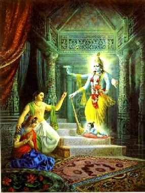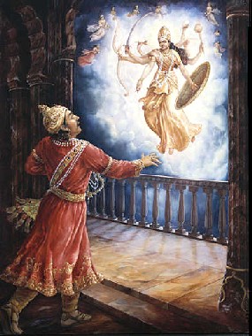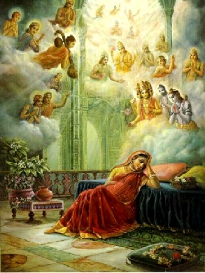 "Querida mãe Devaki, dentro de seu ventre está a Suprema Personalidade de Deus, que aparece junto com todas Suas extensões plenárias. Ele é a Personalidade de Deus original que aparece para nosso bem estar. Por isso você não precisa ficar com medo de seu irmão, o rei de Bhoja. Seu filho, o Senhor Krishna, que é a Personalidade de Deus original, aparecerá para a proteção da piedosa dinastia Yadu. O Senhor não aparecerá sozinho, mas acompanhado de Sua porção plenária imediata, Balarama". Devaki estava com muito medo de seu irmão Kamsa porque ele já tinha matado tantos filhos seus. Ela vivia sempre com muita ansiedade por causa de Krishna. O Vishnu Purana afirma que a fim de tranqüilizar Devaki, todos os semideuses, junto com suas esposas, costumavam visitá-la sempre para encorajá-la a não ter medo de que seu filho fosse morto por Kamsa. Krishna, que estava dentro de seu ventre, apareceria não apenas para diminuir o peso do mundo mas especificamente para defender os interesses da dinastia Yadu, e certamente proteger Devaki e Vasudeva.