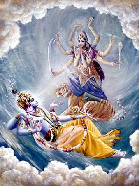 O rei Kamsa não ocupou apenas os reinos das dinastias Yadu, Bhoja e Andhaka e o reino de Shurasena, mas também fez alianças com todos os outros reis demoníacos, como se segue: o demônio Pralamba, demônio Baka, demônio Chanura, demônio Trinavarta, demônio Aghasura, demônio Mustika, demônio Arista, demônio Dwivida, demônia Putana, demônio Keshi e demônio Dhenuka. Naquela época, Jarasandha era o rei da província de Magadha (conhecida atualmente como estado de Bihar). Assim, com sua política diplomática, Kamsa consolidou o reino mais poderoso de seu tempo, sob a proteção de Jarasandha. Ele fez mais alianças com reis como Banasura e Bhaumasura, até ser o mais forte. Então, começou a se comportar de forma altamente hostil contra a dinastia Yadu na qual Krishna ia aceitar Seu nascimento. Perseguidos por Kamsa, os reis das dinastias Yadu, Bhoja e Andhaka começaram a se refugiar em vários estados, como o estado dos Kurus, o estado dos Panchalas, e os estados conhecidos com Kekaya, Shalva, Vidarbha, Nishadha, Videha e Koshala. Kamsa quebrou a solidariedade do reino Yadu, e também de Bhoja e Andhaka. Ele transformou sua posição na mais sólida dentro do vasto pedaço de terra conhecido naquela época como Bharatavarsha. Quando Kamsa matou os seis bebês de Devaki e Vasudeva um depois do outro, muitos amigos e parentes de Kamsa se aproximaram dele e lhe pediram para interromper essas atividades hediondas. Mas todos se tornaram adoradores de Kamsa. Quando Devaki ficou grávida pela sétima vez, uma expansão plenária de Krishna conhecida como Ananta apareceu dentro do ventre dela. Devaki estava subjugada por júbilo e lamentação. Ela estava contente pois pôde entender que o Senhor Vishnu tinha entrado em seu ventre, e ao mesmo tempo, estava aflita pois logo que seu filho nascesse, Kamsa O mataria. Nesse momento, a Suprema Personalidade de Deus, Krishna, compadecido com a situação temerosa dos Yadus, por causa das atrocidades cometidas por Kamsa, ordenou o aparecimento de Sua Yogamaya, ou Sua potência interna. Krishna é o Senhor do universo, porém é especialmente o Senhor da dinastia Yadu. Essa Yogamaya é a potência principal da Personalidade de Deus. Os Vedas afirmam que o Senhor, a Suprema Personalidade de Deus, tem potências múltiplas; parasya saktir vividhaiva sruyate. Todas as diferentes potências agem externamente e internamente, e Yogamaya é a líder de todas potências. Ele ordenou o aparecimento de Yogamaya na terra de Vrajabhumi, em Vrindavana, que é sempre decorada com belas vacas. Em Vrindavana, Rohini, uma das esposas de Vasudeva, estava hospedada na casa do rei Nanda e rainha Yashoda. Não somente Rohini, mas muitos outros da dinastia Yadu estavam espalhados por todo o país devido a seu medo das atrocidades de Kamsa. Alguns deles estavam até mesmo em cavernas nas montanhas. O Senhor então informou Yogamaya: "Devaki e Vasudeva estão dentro da prisão de Kamsa, e no presente momento, Minha expansão plenária Shesha, está dentro do ventre de Devaki. Você pode organizar a transferência de Shesha do ventre de Devaki para o ventre de Rohini. Depois desse arranjo, Eu aparecerei pessoalmente no ventre de Devaki com todas as Minhas potências. Então, Eu aparecerei como o filho de Devaki e Vasudeva. E você deve aparecer como a filha de Nanda e Yashoda em Vrindavana". "Porque você aparecerá como Minha irmã contemporânea, as pessoas do mundo a adorarão com todos tipos de presentes valiosos: incenso, lamparinas, flores e oferendas de sacrifício. Você satisfará rapidamente os desejos delas por desfrute sensual. Pessoas que estão atrás da perfeição materialista a adorarão sob diferentes formas das suas expansões, que serão chamadas Durga, Bhadrakali, Vijaya, Vaishnavi, Kumuda, Chandika, Krishná, Madhavi, Kanyaka, Maya, Narayani, Ishani, Sharada e Ambika". Krishna e Yogamaya apareceram como irmão e irmã; o Supremo Poderoso e o poder supremo. Apesar de não haver distinção clara entre o Poderoso e o poder, poder é sempre subordinado ao Poderoso. Aqueles que são materialistas são adoradores do poder, e os que são transcendentalistas são adoradores do Poderoso. Krishna é o Supremo Poderoso, e Durga é o poder supremo dentro do mundo material. Na realidade, as pessoas da cultura Védica adoram ambos, o Poderoso e o poder. Existem muitas centenas de milhares de templos de Vishnu e Devi, e às vezes são adorados simultaneamente. O adorador do poder, Durga, ou a energia externa de Krishna, pode alcançar todos tipos de sucesso material muito facilmente, mas quem quer ser elevado na transcendência deve se dedicar à adoração do Poderoso em Consciência de Krishna. O Senhor também declarou a Yogamaya que Sua expansão plenária, Ananta Shesha, estava dentro do ventre de Devaki. Porque foi atraído à força para o ventre de Rohini, Ele será conhecido como Sankarshana e será a fonte de todo poder espiritual, ou bala, com o qual a pessoa se torna capaz de alcançar a bem-aventurança mais elevada da vida que é chamada ramana. Por isso, a porção plenária Ananta será conhecida depois de Seu aparecimento como Sankarshana ou Balarama. Os Upanishads afirmam, nayam atma bala-hinena labhyah. O significado é que ninguém pode alcançar a auto-realização suprema ou qualquer outra forma de auto-realização sem ser favorecido por Balarama o suficiente. Bala não quer dizer força física. Ninguém pode alcançar perfeição espiritual com força física. A pessoa tem que ter força espiritual que é dada por Balarama ou Sankarshana. Ananta ou Shesha é o poder que sustenta todos os planetas em suas diferentes posições. Materialmente, esse poder de sustentação é conhecido como lei da gravidade, mas na realidade é uma exibição da potência de Sankarshana. Balarama ou Sankarshana é poder espiritual, ou o mestre espiritual original. Por isso que o Senhor Nityananda Prabhu, que é a encarnação de Balarama, é o mestre esp