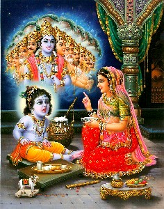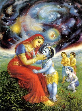 Quando a Suprema Personalidade de Deus Krishna foi assim ordenado por Sua mãe, Ele abriu Sua boca imediatamente como um menino comum. Então, mãe Yashoda viu dentro daquela boca a opulência completa da criação. Ela viu todo o espaço sideral em todas as direções, montanhas, ilhas, oceanos, mares, planetas, ar, fogo, Lua e estrelas. Junto com a Lua e as estrelas, ela também viu todos elementos, água, céu, a existência etérea extensiva junto com o ego total e os produtos dos sentidos e o controlador dos sentidos, todos semideuses, os objetos dos sentidos como som, aroma etc., e as três qualidades da natureza material. Ela também pôde perceber que dentro da boca Dele estavam todos os seres vivos, o tempo eterno, natureza material, natureza espiritual, atividade, consciência e as diferentes formas de toda a criação. Yashoda pôde encontrar dentro da boca de seu filho tudo o que é necessário para a manifestação cósmica. Também viu, dentro da boca Dele, ela mesma a carregar Krishna em seu colo e com Ele a mamar em seus seios. Depois de ver tudo isso, ela ficou atônita e começou a considerar se sonhava ou tinha visto algo extraordinário realmente. Ela concluiu que ou sonhou ou viu a ação da energia ilusória da Suprema Personalidade de Deus. Ela pensou que tinha ficado louca, perturbada mentalmente, por ver todas aquelas coisas maravilhosas. Então ela pensou: "Pode ser poder místico cósmico obtido por meu filho, por isso que estou perplexa com essas visões dentro da boca Dele. Presto minhas respeitosas reverências à Suprema Personalidade de Deus sob cuja energia o eu corpóreo e as possessões corpóreas são concebidas". Depois, ela disse: "Presto minhas respeitosas reverências a Ele sob cuja energia ilusória eu penso que Nanda Maharaja é meu esposo e que Krishna é meu filho, que todas propriedades de Nanda Maharaja pertencem a mim e que todos pastores e pastoras de vaca são meus súditos. Todo esse juízo falso é devido à energia ilusória do Supremo Senhor. Que eu ore a Ele para que possa me proteger sempre".