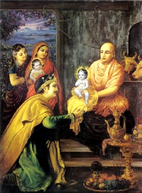 Depois desse incidente, Vasudeva pediu a seu sacerdote familiar, Garga Muni, para visitar a casa de Nanda Maharaja a fim de fazer o cálculo astrológico da vida futura de Krishna. Garga Muni era um grande sábio santo que se submeteu a muitas austeridades e penitências, e foi nomeado sacerdote da dinastia Yadu. Quando Garga Muni chegou à casa de Nanda Maharaja, Nanda Maharaja ficou muito feliz de vê-lo, então se levantou imediatamente com mãos postas e prestou respeitosas reverências a ele. Ele recebeu Garga Muni com a emoção de quem adora Deus ou a Suprema Personalidade de Deus. Ele lhe ofereceu um ótimo lugar para sentar, e depois de sentar, Nanda Maharaja lhe ofereceu uma calorosa recepção. Ele se dirigiu com muita polidez e disse: "Meu querido brahmana, seu aparecimento num lar familiar é somente para iluminar. Estamos sempre ocupados em afazeres domésticos e esquecemos de nosso dever real de auto-realização. Sua vinda à nossa casa é para nos dar alguma iluminação sobre vida espiritual. Você não tem nenhuma outra intenção quando visita chefes de família". Na realidade, uma pessoa santa ou um brahmana não tem nenhum negócio ao visitar os casados que estão sempre ocupados nos assuntos financeiros. Se alguém perguntar: "Por que os casados não procuram uma pessoa santa ou um brahmana para iluminação"? A resposta é que os casados são muito absortos na matéria. Geralmente, os casados acham que sua ocupação nos afazeres familiares é seu dever principal e que auto-realização ou iluminação em conhecimento espiritual é secundário. Unicamente por compaixão, pessoas santas ou brahmanas visitam os lares dos casados. Nanda Maharaja se dirigiu a Garga Muni como uma das grandes autoridades da ciência astrológica. As predições da ciência astrológica, como a ocorrência de eclipses solares ou lunares, são cálculos prodigiosos, e com essa ciência específica, a pessoa pode entender o futuro com muita clareza. Garga Muni era proficiente nesse conhecimento. Por meio desse conhecimento, a pessoa pode entender quais foram suas atividades prévias, e por causa do resultado dessas atividades, a pessoa pode desfrutar ou sofrer nesta vida. Nanda Maharaja também se dirigiu a Garga Muni como "o melhor dos brahmanas". Um brahmana é a pessoa perita em conhecimento do Supremo. Sem conhecimento do Absoluto Supremo, a pessoa não pode ser considerada um brahmana. A palavra exata usada nesse caso é brahma-vidam, que significa aquele que conhece o Supremo muito bem. Um brahmana perito é capaz de conceder facilidades reformatórias para as classes inferiores, a saber, kshatriyas e vaishyas. Os shudras não observam procedimentos reformatórios. O brahmana é considerado mestre espiritual ou sacerdote do kshatriya e do vaishya. Nanda Maharaja era uma vaishya, e aceitou Garga Muni como um brahmana de primeira classe. Dessa forma, ele ofereceu seus dois filhos adotivos, a saber, Krishna e Balarama, para ele purificar. Ele concordou que não somente esses meninos, mas todos seres humanos logo depois do nascimento devem aceitar um brahmana qualificado como mestre espiritual. Depois desse pedido, Garga Muni respondeu: "Vasudeva me enviou para cuidar dos procedimentos reformatórios desses meninos, especialmente Krishna. Sou o sacerdote da família deles, e por acaso, eu acho que Krishna é filho de Devaki". Por meio de seu cálculo astrológico, Garga Muni pôde entender que Krishna era filho de Devaki mas estava sob os cuidados de Nanda Maharaja, o que Nanda não sabia. Indiretamente, ele disse que Krishna, e Balarama também, ambos eram filhos de Vasudeva. Balarama era conhecido como filho de Vasudeva porque Sua mãe Rohini estava presente ali, mas Nanda Maharaja não sabia sobre Krishna. Garga Muni revelou indiretamente o fato de que Krishna era filho de Devaki. Garga Muni também alertou Nanda Maharaja se fizesse a cerimônia reformatória, então Kamsa, que era muito pecaminoso por natureza, entenderia que Krishna era filho de Devaki e Vasudeva. Segundo o cálculo astrológico, Devaki não poderia ter uma filha mulher, apesar de todo mundo achar que o oitavo filho de Devaki era mulher. Desse modo, Garga Muni insinuou a Nanda Maharaja que a criança mulher nasceu de Yashoda e que Krishna nasceu de Devaki, e foram trocados. A criança mulher, ou Durga, também informou Kamsa que a criança que o mataria já tinha nascido em algum outro lugar. Garga Muni afirmou: "Se eu der um nome para seu filho e se Ele satisfizer a profecia da criança mulher para Kamsa, pode ser que esse demônio pecaminoso venha e mate esta criança depois da cerimônia de dar o nome. Todavia, eu não quero ser responsável por todas essas calamidades futuras".