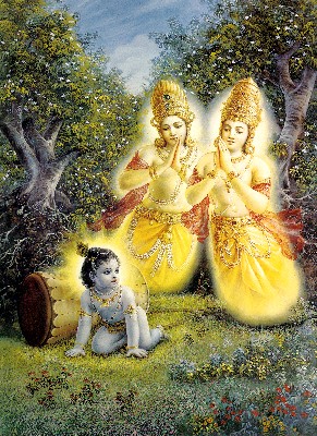 "Querido Senhor Krishna, Você é a Personalidade de Deus original, mestre de todos os poderes místicos. Os brahmanas eruditos sabem muito bem que esta manifestação cósmica é uma expansão de Suas potências que às vezes se manifestam e às vezes não se manifestam. Você é o provedor original da vida, corpo e sentidos de todos os seres vivos. Você é o Deus eterno, Senhor Vishnu, que é todo-penetrante, o controlador principal de tudo. Você é o tempo eterno. Você é a fonte original da manifestação cósmica que age sob o encanto dos três modos da natureza material, bondade, paixão e ignorância. Você vive na forma da Superalma dentro dos seres vivos multiformes, e Você sabe muito bem tudo o que acontece dentro de suas mentes e corpos. Portanto, Você é o diretor supremo de todas as atividades de todos os seres vivos. Apesar de Você estar no meio de tudo que está sob o encanto dos modos materiais da natureza, Você não é afetado por essas qualidades contaminadas. Ninguém sob a jurisdição dos modos materiais pode entender Suas qualidades transcendentais, que existiam antes da criação; por isso Você é chamado de Brahman Supremo que é sempre glorificado por causa de Suas potencias internas pessoais. Neste mundo material, Você só pode ser conhecido por meio de Suas diferentes encarnações. Apesar de assumir diferentes tipos de corpos, esses corpos não fazem parte da criação material. Eles são sempre plenos das potências transcendentais com opulência, poder, beleza, fama, sabedoria e renúncia ilimitados. Na existência material, existe uma diferença entre o corpo e o proprietário do corpo, mas porque Você aparece em Seu corpo espiritual original, não há diferença para Você. Quando Você aparece, Suas atividades incomuns indicam que Você é a Suprema Personalidade de Deus. Essas atividades incomuns não são possíveis para qualquer um dentro da existência material. Você é essa Suprema Personalidade de Deus, que agora apareceu para causar nascimento e morte bem como a liberação dos seres vivos. E Você é completo com todas as Suas expansões plenárias. Você pode conceder todos os tipos de bendições a todos. Ó Senhor! Ó fonte de toda boa fortuna e bondade, prestamos nossas respeitosas reverências a Você. Você é a Suprema Personalidade de Deus todo-penetrante, a fonte da paz e a pessoa suprema da dinastia do rei Yadu. Ó Senhor, nosso pai conhecido como Kuvera, o semideus, é Seu servo. Similarmente, o grande sábio Narada também é Seu servo, e somente pela graça deles fomos capazes de vê-Lo pessoalmente. Por isso, rogamos para que possamos estar sempre ocupados em Seu serviço amoroso transcendental por falar somente sobre Suas glórias e ouvir sobre Suas atividades transcendentais. Que nossas mãos e outros membros estejam comprometidos com Seu serviço e nossas mentes sempre concentradas em Seus pés de lótus e nossas cabeças sempre prostradas perante a forma universal todo-penetrante de Sua Onipotência". Quando os semideuses Nalakuvara e Manigriva terminaram suas preces, o bebê, Senhor Krishna, o senhor e proprietário de Gokula, amarrado ao pilão de madeira com as cordas de mãe Yashoda, começou a sorrir e disse, "Eu já sabia que Meu grande devoto e sábio Narada demonstrou sua misericórdia sem causa ao salvá-los da condição abominável do orgulho devido à posse de beleza e opulência extraordinárias na família dos semideuses. Ele os salvou de deslizarem abaixo para a condição inferior da vida infernal. Todos esses fatos já eram conhecidos por Mim. Vocês são muito afortunados porque não apenas foram amaldiçoados por ele, mas também tiveram a grande oportunidade de vê-lo. Se por acaso, alguém for capaz de ver uma grande pessoa santa igual a Narada face a face, que é sempre sereno e misericordioso com todos, essa alma condicionada imediatamente se torna liberada. Isso é exatamente como estar situado na luz plena do Sol, não existe nenhum impedimento de visão. Portanto, ó Nalakuvara e Manigriva, suas vidas agora se tornaram bem sucedidas porque vocês desenvolveram amor extático por Mim. Este é seu último nascimento dentro da existência material. Agora, vocês podem voltar à residência de seu pai no planeta celestial, e com permanência na atitude do serviço devocional, vocês serão liberados nesta mesma vida". Depois disso, os semideuses circungiraram o Senhor muitas vezes e se prostraram perante Ele repetidamente, e assim partiram. O Senhor permaneceu amarrado com as cordas no pilão de madeira.
