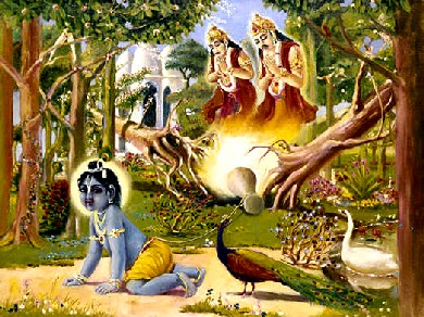 Quando as duas árvores arjuna caíram no chão, com um estrondo parecido com a queda de raios, todos habitantes de Gokula, inclusive Nanda Maharaja, foram imediatamente para o local. Eles ficaram muito abismados ao verem como as duas árvores enormes caíram repentinamente. Porque não acharam nenhuma razão para a queda delas, ficaram intrigados. Quando viram o bebê Krishna amarrado no pilão de madeira com as cordas de Yashoda, começaram a pensar que aquilo foi causado por algum demônio. Senão, como era possível? Ao mesmo tempo, eles estavam muito perturbados porque esses incidentes incomuns sempre aconteciam com o bebê Krishna. Enquanto os pastores de vacas mais velhos contemplavam dessa forma, as crianças que brincavam ali contaram para os adultos que as árvores caíram porque Krishna puxou o pilão de madeira com as cordas nas quais estava amarrado. "Krishna passou no meio das duas árvores", eles explicaram, "o pilão de madeira estava caído e ficou preso entre as duas árvores. Krishna começou a puxar a corda, e as árvores caíram. Quando as duas árvores caíram, dois homens muito brilhantes saíram das árvores, e começaram a falar com Krishna". A maioria dos pastores adultos não acreditou na afirmação das crianças. Eles não podiam acreditar que essas coisas eram possíveis. Alguns deles, entretanto, acreditaram e disseram a Nanda Maharaja, "seu filho é diferente das outras crianças. Ele pode ter feito isso". Nanda Maharaja começou a sorrir, ao ouvir sobre as habilidades extraordinárias de seu filho. Ele foi em frente e desatou o nó para soltar seu filho prodigioso. Depois de ser solto por Nanda Maharaja, Krishna foi pego no colo pelas gopis mais velhas. Elas O levaram para o quintal da casa e começaram a bater palmas, e elogiar Suas atividades maravilhosas. Krishna começou a bater palmas junto com elas como uma criança ordinária. O Supremo Senhor Krishna, completamente controlado pelas gopis, começou a cantar e dançar como uma marionete em suas mãos. Às vezes, mãe Yashoda costumava pedir para Krishna trazer uma prancha de madeira para ela sentar. Apesar da prancha de madeira ser muito pesada para uma criança carregar, mesmo assim Krishna de algum jeito conseguia trazê-la para Sua mãe. Às vezes, durante a adoração a Narayana, Seu pai pedia para Ele trazer seus chinelos de madeira, e Krishna, com muita dificuldade, punha os chinelos em Sua cabeça e os levava a Seu pai. Quando pediam para Ele levantar algum objeto pesado e Ele não conseguia levantá-lo, simplesmente mexia Seus braços. Desse modo, diariamente, em cada momento, Ele era o reservatório de prazer de Seus pais. O Senhor exibiu essas atividades infantis para os habitantes de Vrindavana porque Ele queria mostrar aos grandes filósofos e sábios que procuram pela Verdade Absoluta como a Suprema Verdade Absoluta Personalidade de Deus é controlada e sujeita aos desejos de Seus devotos puros.