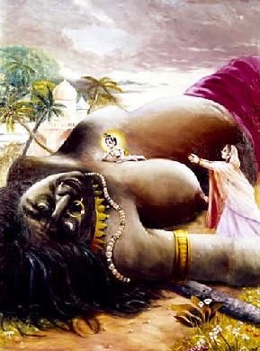 Quando ela morreu, aos berros, ressoou uma vibração tremenda tanto na terra quando no céu, em todas as direções, e as pessoas acharam que raios caiam. Assim, o pesadelo da bruxa Putana terminou, e ela assumiu sua forma real como uma demônia gigante. Ela abriu sua boca terrível e espalhou seus braços e pernas por toda parte. Ela caiu igual a Vritrasura quando foi atingido pelo raio de Indra. Os longos cabelos em sua cabeça se espalharam por todo seu corpo. Seu corpo caído se estendeu por vinte quilômetros e espatifou todas as árvores em pedaços, e todos ficaram abismados ao ver aquele corpo gigantesco. Os dentes dela pareciam arados, e suas narinas pareciam cavernas de montanhas. Seus seios pareciam pequenas montanhas, e seu cabelo parecia um arbusto avermelhado. Seus globos oculares pareciam poços fundos, e suas duas coxas pareciam as duas margens de um rio; suas duas mãos pareciam duas pontes reforçadas fortemente, e seu abdômen parecia um lago seco. Todos os pastores e pastoras de vacas ficaram abismados ao ver essa cena. E o som estrondoso da queda dela abalou seus cérebros e ouvidos, e fez seus corações baterem fortemente.