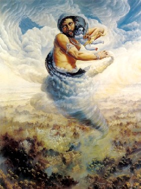Certo dia, logo depois dessa cerimônia, quando mãe Yashoda ninava seu bebê no colo, sentiu o bebê extremamente pesado, e sem conseguir carregá-Lo, ela O colocou no chão sem querer. Depois de um tempo, ela se ocupou nos afazeres domésticos. Nesse momento, um dos servos de Kamsa, conhecido como Trinavarta, instruído por Kamsa, apareceu lá na forma de um furacão. Ele pegou a criança em seus ombros e levantou uma grande tempestade de poeira por toda Vrindavana. Por causa disso, a visão de todos ficou encoberta por alguns momentos, e toda a área de Vrindavana ficou densamente escura tanto que ninguém conseguia ver nem si mesmo ou qualquer outro. Durante essa grande catástrofe, mãe Yashoda não podia ver seu bebê, que foi levado pelo furacão, e começou a chorar comoventemente. Ela caiu no chão do mesmo modo que uma vaca que acabou de perder seu bezerro. Enquanto mãe Yashoda chorava tão desesperadamente, todas as pastoras de vacas vieram imediatamente e começaram a procurar o bebê, mas ficaram desapontadas por não conseguirem achá-Lo. O demônio Trinavarta que levou o bebê Krishna em seus ombros subiu muito alto no céu, mas o bebê assumiu tamanho peso que subitamente ele não conseguiu ir mais alto, e foi obrigado a parar suas atividades de furacão. O bebê Krishna se fez muito pesado e começou a fazer o demônio descer com Seu peso. O Senhor agarrou seu pescoço. Trinavarta sentiu o bebê tão pesado quanto uma grande montanha, e tentou se livrar de Suas garras, mas não conseguiu, e seus olhos saltaram de suas órbitas oculares. Com um grito aterrorizante, ele caiu no chão de Vrindavana e morreu. O demônio caiu igual a Tripurasura, que foi traspassado pela flecha do Senhor Shiva. Ele caiu no chão de pedra, e seus membros quebraram. Seu corpo ficou visível para todos habitantes de Vrindavana.