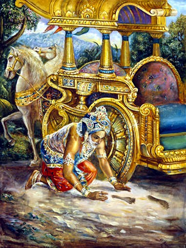O cuidador, assim insultado por Krishna, ficou muito irado, e a fim de desafiar Krishna, como planejou previamente, provocou o elefante para atacar. O elefante então se moveu perante Krishna como a morte inevitável. Investiu contra Ele e tentou pegá-Lo com sua tromba, porém Krishna com muita agilidade foi para trás do elefante. Como só era capaz de ver até o fim de seu nariz, o elefante não conseguia ver Krishna escondido atrás de suas pernas, mesmo assim tentou capturá-Lo com sua tromba. Krishna novamente com muita rapidez escapou da captura, e Ele novamente foi para trás do elefante e pegou seu rabo. Krishna segurou o elefante pelo rabo, e começou a puxá-lo, e com muita grande potência, Ele o arrastou por pelo menos vinte e cinco metros, da mesma forma como Garuda arrasta uma serpente insignificante. Krishna puxou o elefante de um lado para o outro, da direita para a esquerda, da mesma forma como Ele costumava puxar o rabo de um bezerro em Sua infância. Depois disso, Krishna foi para a frente do elefante e deu nele um forte tapa. Então, Ele sumiu da frente da visão do elefante e subiu em suas costas. Depois, caído no chão, Krishna Se pôs na frente das duas pernas do elefante o que causou seu tropeço e queda. Krishna Se levantou imediatamente, porém o elefante pensou que Ele ainda estava deitado no chão, e tentou perfurar o corpo de Krishna com um dente de marfim assim apunhalou o chão com força. Apesar do elefante estar atormentado e furioso, o cuidador montado em sua cabeça tentou provocá-lo mais ainda. O elefante então avançou loucamente em direção a Krishna. Logo que ele chegou ao alcance, Krishna pegou sua tromba, e puxou o elefante para baixo. Quando o elefante e o cuidador caíram, Krishna pulou nas costas do elefante e a quebrou, e também matou o cuidador. Depois de matar o elefante, Krishna pôs um dente de marfim no Seu ombro. Decorado com gotas de transpiração e manchado com o sangue do elefante, Ele Se sentiu muito bem aventurado, então começou a proceder em direção ao campo de luta. O Senhor Balarama pegou o outro dentre de marfim do elefante em Seu ombro. Acompanhados por Seus amigos meninos pastores de vacas, Eles entraram na arena.