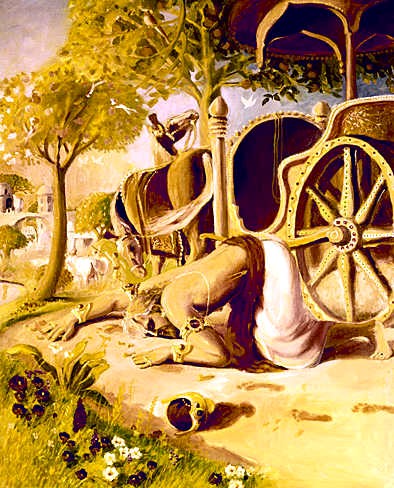 Enquanto Krishna e Balarama passavam dessa forma, Eles viram um tintureiro lavador de roupas. Krishna ficou feliz em pedir a ele algumas roupas finas. Ele também prometeu se o tintureiro Lhe desse os melhores tecidos tingidos, ele seria muito feliz, e toda a boa fortuna seria dele. Krishna não era nem mendigo nem precisava de roupas, porém pelo Seu pedido, Ele indicou que todos devem estar prontos a oferecer tudo para Krishna o que Ele desejar. Esse é o propósito da Consciência de Krishna. Infelizmente, esse tintureiro era servo de Kamsa e por isso não pôde apreciar o pedido do Senhor Krishna, a Suprema Personalidade de Deus. Esse é o efeito da má associação. Ele poderia entregar a roupa imediatamente para a Suprema Personalidade de Deus, que lhe prometeu boa fortuna, mas por ser um servo de Kamsa, o demônio pecaminoso não pôde aceitar a oferta. Em vez de ficar satisfeito, ele ficou muito bravo e recusou o pedido do Senhor ao dizer: "Como é que Você pede roupa que é destinada ao rei"? O tintureiro então começou a instruir Krishna e Balarama: "Meus queridos meninos, no futuro, não sejam tão insolentes a ponto de pedir coisas que pertencem ao rei. De outra forma, serão punidos pelos homens do governo. Eles prenderão Vocês e Os punirão, e Vocês ficarão em dificuldade. Eu tenho experiência prática com esse fato. Qualquer um que deseje usar a propriedade do rei ilegalmente é punido severamente". Ao ouvir isso, o Senhor Krishna, o filho de Devaki, ficou muito bravo com o tintureiro, e o golpeou com a parte superior de Sua mão, assim Ele separou a cabeça do corpo do homem. O tintureiro caiu morto no chão. Dessa forma, o Senhor Krishna confirmou a afirmação de que cada membro do Seu corpo é capaz de fazer tudo que Ele desejar. Sem uma espada, porém simplesmente com Sua mão, Ele cortou a cabeça do tintureiro. Essa é a prova de que o Supremo Senhor é onipotente. Se Ele quiser fazer algo, Ele pode fazê-lo sem ajuda alheia. Depois desse incidente medonho, os empregados do tintureiro se dispersaram imediatamente, e abandonaram os tecidos. Krishna e Balarama tomaram posse deles e Se vestiram de acordo com Sua escolha; o resto dos tecidos foi oferecido aos meninos pastores de vacas, que também os usaram do jeito que desejaram. O que eles não usaram ficou lá. Eles então seguiram adiante. Nesse meio tempo, um alfaiate devoto aproveitou a oportunidade de serviço e preparou algumas roupas finas com os tecidos para Krishna e Balarama. Assim muito bem vestidos, Krishna e Balarama pareciam elefantes vestidos com panos coloridos no dia da lua negra na lua cheia. Krishna ficou muito satisfeito com o alfaiate e lhe concedeu a bendição de sarupya-mukti, significa que depois de deixar seu corpo, ele será liberado e obterá um corpo exatamente igual ao de Narayana com quatro mãos nos planetas Vaikuntha. E também concedeu a ele que enquanto vivesse ganharia opulência suficiente para ser capaz de desfrutar prazer sensual. Com esse incidente, Krishna provou que aqueles que são devotos conscientes de Krishna não terão falta de desfrute material ou prazer sensual. Eles terão oportunidade suficiente para essas coisas, todavia depois de deixarem esta vida, terão permissão para entrar nos planetas espirituais de Vaikunthaloka ou Krishnaloka, Goloka Vrindavana. Depois de Se vestirem bem, Krishna e Balarama foram a um florista de nome Sudama. Assim que chegaram aos arredores da casa dele, o florista imediatamente saiu e com muita devoção caiu sobre sua face para prestar respeitosas reverências. Ele ofereceu um bom assento a Krishna e Balarama e pediu a seu assistente para trazer flores e nozes de bétel cobertas com polpa de chandana. O florista deu as boas-vindas com grande satisfação ao Senhor. O florista com muita humildade e submissamente ofereceu suas preces ao Senhor, ao dizer: "Meu querido Senhor, porque o Senhor veio à minha casa, acho que todos os meus antepassados e todos os meus superiores veneráveis estão satisfeitos e liberados. Meu querido Senhor, Você é a suprema causa de todas as causas desta manifestação cósmica, porém para o benefício dos residentes deste planeta Terra, Você apareceu com Sua porção plenária para dar proteção a Seus devotos e aniquilar os demônios. Você é igualmente disposto como amigo de todos os seres vivos; Você é a Superalma, e Você não discrimina entre amigo e inimigo. Ainda assim, Você fica satisfeito em dar a Seus devotos o resultado especial de suas atividades devocionais. Meu Senhor, rogo que Você me diga por favor qualquer coisa que Você deseja que eu faça, porque eu sou Seu servo eterno. Se Você permitirá que eu faça alguma coisa, será um grande favor para mim". O florista, Sudama, estava muito satisfeito em seu coração por ver Krishna e Balarama em sua casa, e assim, como seu desejo mais seleto, ele fez dois colares de flores primorosos com várias flores e os presenteou ao Senhor. Krishna e Balarama ficaram muito contentes com seu serviço sincero, e Krishna ofereceu ao florista Sua saudação e bênção, que Ele sempre está preparado a conceder às almas rendidas. Quando a bênção foi oferecida ao florista, ele implorou ao Senhor para poder continuar como Seu servo eterno em serviço devocional e com esse serviço fazer o bem a todas as criaturas vivas. Assim, fica claro que um devoto do Senhor em Consciência de Krishna não deve ficar satisfeito somente com seu próprio avanço no serviço devocional; ele deve desejar trabalhar para o bem estar de todos os outros. Esse exemplo foi seguido pelos seis Goswamis de Vrindavana. Por isso está afirmado na prece deles, lokanam hitakarinau: Vaishnavas, ou devotos do Senhor, não são egoístas. Qualquer benefício que obtêm da Suprema Personalidade de Deus como bênção, eles querem distribuir a todas outras pessoas. Essa é a maior das atividades humanitárias. Satisfeito com o florista, o Senhor Krishna não somente deu a ele a b