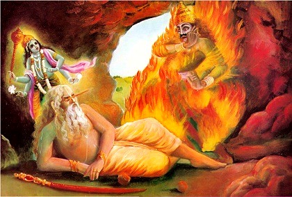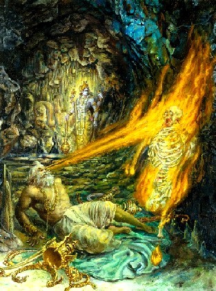 Quando Maharaja Parikshit ouviu esse incidente de Kalayavana queimar até as cinzas, inquiriu sobre o homem que dormia a Shukadeva Goswami: "Quem era ele? Por que ele dormia ali? Como ele adquiriu tanto poder que instantaneamente, com seu olhar, Kalayavana foi queimado até as cinzas? Como aconteceu dele estar deitado na caverna da montanha"? Muitas perguntas foram colocadas perante Shukadeva Goswami, e Shukadeva também respondeu, como se segue. "Meu querido rei, essa pessoa nasceu numa família muito grandiosa do rei Iksvaku, na qual o Senhor Ramachandra também nasceu, e acontece que ele é o filho de um grande rei conhecido como Mandhata. Ele próprio também era uma grande alma e era conhecido popularmente como Muchukunda. O rei Muchukunda era um seguidor muito estrito dos princípios Védicos da cultura brahmana, e era veraz com sua promessa. Ele era tão poderoso que até mesmo os semideuses como Indra e outros costumavam pedir a ele que fizesse o favor de ajudar na luta contra os demônios, e por isso, ele freqüentemente lutava contra os demônios para proteger os semideuses". O comandante supremo dos semideuses, conhecido como Karttikeya, estava satisfeito com a luta do rei Muchukunda, entretanto certa vez ele pediu ao rei, que havia passado por grande dificuldade na luta contra os demônios, que se aposentasse do combate e descansasse. O comandante supremo, Karttikeya, disse ao rei Muchukunda: "Meu querido rei, você sacrificou tudo pela causa dos semideuses. Você tinha um reino muito bom não perturbado por qualquer tipo de inimigo. Você deixou esse reino, você negligenciou sua opulência e propriedades, e você nunca se importou com a satisfação de sua ambição pessoal. Devido à sua longa ausência do seu reino enquanto lutava contra os demônios pela causa dos semideuses, sua família, seus filhos, seus parentes e seus ministros todos desapareceram no devido curso do tempo. Tempo e maré não esperam por nenhum ser humano vivo. Mesmo agora, se você se retirar no seu lar, verá que ninguém mais vive lá. A influência do tempo é muito forte; todos os seus familiares desapareceram no devido curso do tempo. Tempo é tão forte e poderoso porque é uma representação da Suprema Personalidade de Deus; o tempo é portanto mais forte do que o mais poderoso. Pela influência do tempo, mudanças em coisas sutis podem ter efeito sem nenhuma dificuldade. Ninguém pode impedir o processo do tempo. Do mesmo modo que um domador de animais doma animais de acordo com sua vontade, o tempo também entra nas coisas de acordo com seu próprio desejo. Ninguém pode substituir o arranjo feito pelo tempo supremo". Depois de falar com Muchukunda dessa forma, os semideuses rogaram a ele que pedisse qualquer tipo de bênção que ele ficasse satisfeito em recebê-la, com exceção da bênção de liberação. Liberação não pode ser concedida por nenhum ser vivo exceto a Suprema Personalidade de Deus, Vishnu. Portanto outro nome do Senhor Vishnu ou Krishna é Mukunda, Aquele que pode conceder liberação. O rei Muchukunda não dormia por muitos e muitos anos. Ele estava dedicado ao dever de lutar, e por isso estava muito cansado. Assim quando o semideus ofereceu bênção, Muchukunda simplesmente pensou em dormir. Ele respondeu como se segue: "Meu querido Karttikeya, o melhor dos semideuses, eu quero dormir agora, e quero de você a seguinte bênção. Conceda-me o poder de queimar, por meu mero olhar, até as cinzas qualquer um que tentar perturbar meu sono e me acordar prematuramente. Peço o favor que me conceda essa bênção". O semideus concordou e também deu a ele a bênção que ele conseguiria ter repouso completo. Então o rei Muchukunda entrou na caverna da montanha. Com o poder da bênção de Karttikeya, Kalayavana queimou até as cinzas simplesmente por Muchukunda olhar para ele. Quando o incidente terminou, Krishna apareceu perante o rei Muchukunda. Krishna entrou na caverna realmente para liberar o rei Muchukunda de sua austeridade, entretanto Ele não apareceu primeiro perante ele. Fez o arranjo para que primeiro Kalayavana viesse perante ele. Assim é o caminho das atividades da Suprema Personalidade de Deus; Ele faz uma coisa de tal forma que muitos outros propósitos são servidos. Ele queria liberar o rei Muchukunda, que dormia dentro da caverna, e ao mesmo tempo, Ele queria matar Kalayavana, que atacou a Cidade de Mathura. Com essa ação, Ele serviu a todos os propósitos.