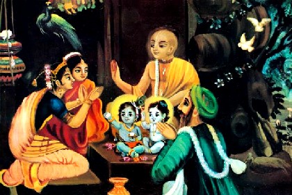 Ao ouvir isso, Krishna mergulhou até as águas profundas e capturou o demônio Pañchajana. Ele o matou no local, mas não pôde encontrar o filho de Seu professor dentro do seu estômago. Assim Ele pegou o corpo morto do demônio (na forma de uma concha) e voltou para Sua quadriga na praia de Prabhasakshetra. De lá, Ele partiu para Samyamani, a residência de Yamaraja, o superintendente da morte. Acompanhado por Seu irmão mais velho Balarama, que também é conhecido como Halayudha, Krishna chegou lá e soprou Seu búzio. Quando ouviu a vibração, Yamaraja apareceu e recebeu Sri Krishna com todas as respeitosas reverências. Yamaraja podia entender quem eram Krishna e Balarama, e por isso ele imediatamente ofereceu seu humilde serviço ao Senhor. Krishna apareceu na superfície da Terra como um ser humano ordinário, porém na realidade Krishna e Balarama são a Superalma que vive no coração de cada ser vivo. Eles são o próprio Vishnu, porém atuavam como meninos humanos ordinários. Quando Yamaraja ofereceu seus serviços ao Senhor, Sri Krishna pediu a ele para devolver o filho de Seu professor, que veio a ele como um resultado de seu trabalho. "Por Considerar minha soberania como suprema", disse Krishna, "você deve devolver imediatamente o filho de Meu professor". Yamaraja devolveu o menino para a Suprema Personalidade de Deus, e Krishna e Balarama o levaram para seu pai. Os irmãos perguntaram se o Seu professor tinha mais alguma coisa para pedir a Eles, mas ele respondeu: "Meus queridos filhos, Vocês fizeram bastante por mim. Agora estou completamente satisfeito. Qual carência mais pode haver para um homem que tem discípulos como Vocês? Meus queridos meninos, Vocês podem ir para casa agora. Esses atos gloriosos de Vocês sempre serão célebres por todo o mundo. Vocês estão acima de todas as bênçãos, mesmo assim é meu dever abençoá-Los. Eu Lhes dou a bênção de que tudo que Vocês falarem permanecerá eternamente fresco como a instrução dos Vedas. Seus ensinamentos não somente serão honrados dentro deste universo ou neste milênio, mas em todos lugares e eras e permanecerá crescentemente novo e importante". Por causa dessa bênção de Seu professor, o Bhagavad-gita do Senhor Krishna é sempre crescentemente fresco e não apenas célebre dentro deste universo, mas em outros planetas e em outros universos também. Ordenados por Seu professor, Krishna e Balarama imediatamente retornaram ao lar em Suas quadrigas. Eles viajavam em grandes velocidades como o vento e produziam sons como a colisão de nuvens. Todos os residentes de Mathura, que não viam Krishna e Balarama por um longo tempo, ficaram muito contentes de vê-Los novamente. Eles sentiram muita alegria, como uma pessoa que recuperou sua propriedade perdida.