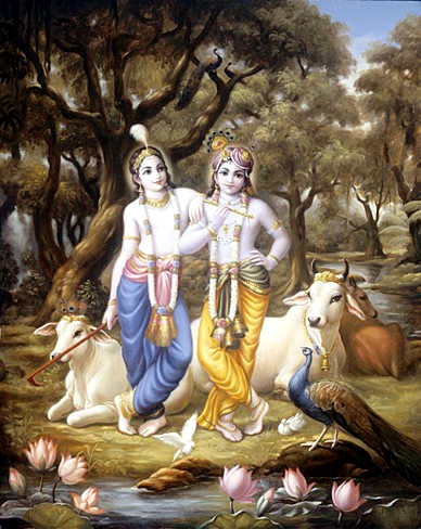 Dessa forma, Akrura, que era o filho de Shwaphalka, meditou em Sri Krishna em sua viagem desde Mathura. Ele chegou a Vrindavana no fim do dia. Akrura passou toda a viagem sem saber quanto tempo demorou. Quando ele alcançou Vrindavana, o Sol se punha. Logo que entrou nos limites de Vrindavana, ele viu as pegadas das vacas e as pegadas do Senhor Krishna, impressas com os sinais de Sua sola, a flâmula, tridente, raio e flor de lótus. Depois de ver as pegadas de Krishna, Akrura pulou imediatamente da carruagem, em respeito. Ele ficou tomado com todos os sintomas de êxtase; ele chorou, e seu corpo tremia. Por causa do júbilo extremo depois de ver a poeira tocada pelos pés de lótus de Krishna, Akrura caiu prostrado com sua face e começou a rolar no chão. A viagem de Akrura a Vrindavana é exemplar. A pessoa que intenciona visitar Vrindavana deve seguir os passos ideais de Akrura e sempre pensar nos passatempos e atividades do Senhor. Logo que a pessoa chega aos arredores de Vrindavana, deve imediatamente passar a poeira de Vrindavana sobre seu corpo sem pensar em sua posição ou prestígio material. Narottamadasa Thakur cantou em sua célebre canção, Vishaya-chariya kave shuddha have mana: "Quando minha mente ficar purificada depois de deixar a contaminação do prazer sensual material, estarei apto para visitar Vrindavana". Na verdade, ninguém pode ir a Vrindavana por comprar uma passagem. O processo de ir a Vrindavana é demonstrado por Akrura. Quando Akrura entrou em Vrindavana, ele viu Krishna e Balarama dedicados a supervisionar a ordenha das vacas. Krishna estava vestido com roupas amarelas e Balarama com azul. Akrura também viu que os olhos de Krishna eram exatamente iguais à belamente desabrochada flor de lótus da estação de outono. Ele viu os dois Krishna e Balarama no desabrochar de Sua juventude. Embora os dois sejam similares nas características corpóreas, Krishna era escuro em compleição, enquanto Balarama era esbranquiçado. Os dois são o abrigo da deusa da fortuna. Eles tinham corpos bem construídos, belas mãos e faces agradáveis, e Eles eram tão fortes quanto elefantes. Agora, depois de ver as pegadas Deles, Akrura viu realmente Krishna e Balarama, face a face. Apesar Deles serem as personalidades de mais influência, Eles olhavam para ele com rostos sorridentes. Akrura pôde entender que ambos Krishna e Balarama voltavam do pastoreio das vacas na floresta; Eles tomaram Seus banhos e vestiam roupas limpas e usavam colares de flores e colares de jóias preciosas. Seus corpos estavam untados com polpa de sândalo. Akrura apreciou grandemente o aroma das flores e do sândalo e a presença corpórea Deles. Ele se considerou muito afortunado por ver Krishna, a Suprema Personalidade de Deus, e Sua porção plenária, Balarama, face a face, porque ele sabia que Eles eram as personalidades originais da criação. Como está afirmado no Brahma-samhita, Krishna é a Personalidade de Deus original e a causa de todas as causas. Akrura pôde entender que a Suprema Personalidade de Deus apareceu pessoalmente para o benefício de Sua criação, para restabelecer os princípios da religião e para aniquilar os demônios. Com Seu esplendor corpóreo, os irmãos dissipavam toda a escuridão do mundo, como se Eles fossem montanhas de safira e prata. Sem hesitar, Akrura desceu imediatamente de sua carruagem e caiu prostrado, justamente igual a uma vara, perante Krishna e Balarama. Depois de tocar os pés de lótus da Suprema Personalidade de Deus, ele ficou extasiado com bem-aventurança transcendental; sua voz ficou embargada e ele não conseguia falar. Devido à presença transcendental de Krishna, torrentes incessantes de lágrimas escorriam de seus olhos. Ele ficou atordoado em êxtase, como privado de todos seus poderes de ver e falar. O Senhor Krishna, que é muito bondoso com Seus devotos, levantou Akrura com Sua mão e o abraçou. Parecia que o Senhor Krishna estava muito feliz com Akrura. Balarama também abraçou Akrura. Os dois o pegaram pela mão, assim Krishna e Balarama o levaram à Sua sala de estar, onde ofereceram a ele um assento muito bom e água para lavar seus pés. Eles também o adoraram com oferendas apropriadas de mel e outros ingredientes. Quando Akrura estava sentado confortavelmente, Krishna e Balarama juntos ofereceram a ele uma vaca em caridade e trouxeram vários pratos saborosos para a refeição, e Akrura aceitou tudo. Depois que Akrura acabou de comer, Balarama deu a ele nozes de bétel e condimentos, e também polpa de sândalo, justamente para deixá-lo mais satisfeito e confortável. O sistema Védico de receber visitas foi observado completamente pelo Senhor Krishna em pessoa para ensinar a todos os outros como receber um convidado em casa. É um mandamento Védico mesmo o convidado que for inimigo deve ser recebido tão bem a ponto de não ter nenhuma apreensão em relação ao anfitrião. Se o anfitrião for um homem pobre, deve pelo menos oferecer uma esteira de palha como assento e um copo de água para beber. Krishna e Balarama deram as boas vindas a Akrura justamente adequadas à posição exaltada dele. Depois que Akrura foi devidamente recebido e assentado, Nanda Maharaja, o pai adotivo de Krishna, disse: "Meu querido Akrura, o que devo perguntar a você? Sei que é protegido por Kamsa, que é extremamente cruel e demoníaco. Sua proteção é igual à proteção do dono do matadouro aos animais que matará no futuro. Kamsa é tão egoísta que matou os filhos de sua própria irmã, por isso como posso acreditar honestamente que ele protege os cidadãos de Mathura"? Essa afirmação é muito significativa. Se os líderes políticos ou chefes executivos do estado estiverem simplesmente interessados em si mesmos, nunca vão poder olhar pelo benefício dos cidadãos. À medida que Nanda Maharaja falava com Akrura palavras agradáveis, Akrura esqueceu toda a fadiga de seu dia de viagem de Mathura a Vrindavana.