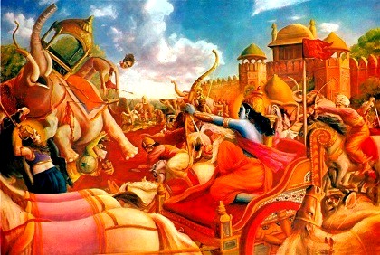 Depois de sua morte, as duas esposas de Kamsa ficaram viúvas. De acordo com a civilização Védica, uma mulher nunca é independente. Ela tem três estágios de vida: Na infância, uma mulher deve viver sob a proteção de seu pai, uma mulher jovem deve viver sob a proteção de seu jovem marido, e no caso da morte de seu marido, ela deve viver sob a proteção de seus filhos crescidos, ou se não tiver filhos crescidos, ela deve voltar a seu pai e viver como uma viúva sob a proteção dele. Parece que Kamsa não tinha filhos crescidos. Depois que se tornaram viúvas, suas esposas retornaram ao abrigo do pai delas. Kamsa tinha duas rainhas. Uma era Asti, e a outra Prapti, e as duas eram filhas do rei Jarasandha, o soberano da província de Bihar (conhecida naqueles dias como Magadharaja). Depois de chegarem à casa, as duas rainhas explicaram sua posição desagradável depois da morte de Kamsa. O rei de Magadha, Jarasandha, ficou mortificado ao ouvir a condição lamentável delas por causa da morte. Quando informado da morte de Kamsa, Jarasandha decidiu no local que livraria o mundo de todos os membros da dinastia Yadu. Ele decidiu porque Krishna matou Kamsa, toda a dinastia dos Yadus deveria ser morta. Ele começou a fazer arranjos extensos para atacar o reino de Mathura com suas inumeráveis falanges militares, que consistiam de muitos milhares de quadrigas, cavalos, elefantes e soldados de infantaria. Jarasandha preparou treze dessas falanges militares com o propósito de retaliar a morte de Kamsa. Ele levou consigo todo seu poderio militar e atacou a capital dos reis Yadu, Mathura, assim a cercou por todas as direções. Sri Krishna, que apareceu como um ser humano ordinário, viu o imenso poderio de Jarasandha, que parecia um oceano pronto para cobrir uma praia a qualquer momento. Ele também percebeu que os habitantes de Mathura estavam dominados pelo medo. Ele começou a pensar dentro de Si mesmo sobre a situação de Sua missão como uma encarnação e como confrontar a situação presente perante Ele. Sua missão era diminuir a população sobrecarregada do mundo inteiro; assim Ele aproveitou a oportunidade de encarar tantos homens, quadrigas, elefantes e cavalos. O poderio militar de Jarasandha apareceu perante Ele, e Ele decidiu matar toda a força de Jarasandha para que eles não pudessem retroceder e novamente reorganizar seu poderio militar. Enquanto o Senhor Krishna pensava dessa forma, duas quadrigas militares, plenamente equipadas com cocheiros, armas, flâmulas e outros implementos, chegaram perante Ele do espaço exterior. Krishna viu os dois cocheiros presentes diante Dele, e Ele imediatamente Se dirigiu a Seu irmão companheiro, Balarama, que também é conhecido como Sankarshana: "Meu querido irmão mais velho, Você é o melhor entre os Arianos, Você é o Senhor do universo, e especificamente, Você é o protetor da dinastia Yadu. Os membros da dinastia Yadu sentem um grande perigo perante os soldados de Jarasandha, e estão muito aflitos. Justamente para dar proteção a eles, Sua quadriga também está aqui, cheia de armas militares. Eu peço que Você sente na Sua quadriga e mate todos esses soldados, toda a força militar do inimigo. Naturalmente, Nós dois descendemos a esta Terra justamente para aniquilar tais forças belicosas desnecessárias e para dar proteção aos devotos piedosos. Assim temos a oportunidade de cumprir Nossa missão. Por favor, que Nós a executemos". Assim Krishna e Balarama, os descendentes do rei Gadaha, Dasharha, decidiram aniquilar as treze companhias militares de Jarasandha. Krishna subiu na quadriga a qual Daruka era o condutor e com um pequeno exército, e com o soar dos búzios, Ele saiu da cidade de Mathura. Curiosamente o bastante, apesar do partido oposto estar equipado com força militar maior, justamente depois de ouvir a vibração do búzio de Krishna, seus corações estremeceram. Quando Jarasandha viu os dois, Krishna e Balarama, ficou um pouco compassivo, porque ambos Krishna e Balarama tinham um parentesco com ele como netos. Ele especificamente chamou Krishna de Purushadhama, que quer dizer o mais baixo dos homens. Na realidade, Krishna é conhecido em todas literaturas Védicas como Purushottama, o mais elevado dos homens. Jarasandha não tinha intenção de se dirigir a Krishna como Purushottama, entretanto grandes eruditos determinaram o verdadeiro significado da palavra purushadhama como "aquele que faz todas as outras personalidades irem abaixo". Na realidade, ninguém pode ser igual ou maior do que a Suprema Personalidade de Deus. Jarasandha disse: "Será uma grande desonra se eu lutar com meninos como Krishna e Balarama". Porque Krishna matou Kamsa, Jarasandha especificamente O chamou de matador de seus parentes pessoais. Kamsa matou tantos de seus próprios sobrinhos, mesmo assim Jarasandha não se importou com isso; porém porque Krishna matou Seu tio materno, Kamsa, Jarasandha tentou criticá-Lo. Assim é o caminho do tratamento demoníaco. Demônios não tentam encontrar suas próprias falhas mas tentam encontrar as faltas de seus amigos. Jarasandha também criticou Krishna por nem mesmo ser um kshatriya. Porque foi criado por Maharaja Nanda, Krishna não era um kshatriya, e sim um vaishya. Vaishyas geralmente são chamados de guptas, e a palavra gupta também pode ser usada para significar "oculto". Assim Krishna foi tanto escondido quanto criado por Nanda Maharaja. Jarasandha acusou Krishna de três falhas: que Ele matou seu próprio tio materno, que Ele foi escondido em Sua infância, e que Ele nem era um kshatriya. E por isso que Jarasandha sentia vergonha de lutar com Ele. Em seguida, ele se voltou a Balarama e disse a Ele: "Você, Balarama! Se Você quiser, pode lutar junto com Ele, e se Você tiver paciência, então pode esperar para ser morto por minhas flechas. Assim poderá ser promovido ao céu". Está afirmado no Bhagavad-gita que um kshatriya pode ser favorecido de duas formas enquanto 