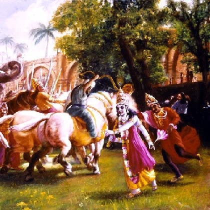 Depois de tomarem Seus banhos e terminarem Seus deveres matinais, Krishna e Balarama ouviram o bater dos tambores no campo de luta. Eles Se prepararam imediatamente para procederam ao local para ver a diversão. Quando Krishna e Balarama chegaram ao portal do campo de luta, viram um grande elefante de nome Kuvalayapida que era guiado por um cuidador. O cuidador deliberadamente bloqueava a entrada Deles com o elefante em frente ao portal. Krishna pôde entender o propósito do cuidador, e Se preparou ao apertar Sua roupa antes de combater o elefante. Ele começou a Se dirigir ao cuidador com a voz bem grave, que ressoava como uma nuvem: "Seu cuidador miserável, dê passagem e deixe-Me passar pelo portal. Se você bloquear Meu caminho, mandarei você e seu elefante à casa da morte personificada".