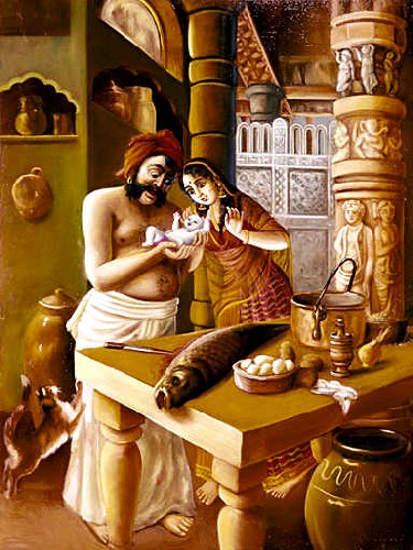 É dito que Cupido, que é diretamente parte e parcela do Senhor Vasudeva e que anteriormente foi queimado até as cinzas pela ira do Senhor Shiva, nasceu no ventre de Rukmini gerado por Krishna. Esse é Kamadeva, um semideus dos planetas celestiais especialmente capaz de induzir desejos luxuriosos. A Suprema Personalidade de Deus, Krishna, tem vários graus de partes e parcelas, contudo as expansões quádruplas de Krishna - Vasudeva, Sankarshana, Pradyumna e Aniruddha - estão diretamente na categoria de Vishnu. Kama, ou o semideus Cupido, que mais tarde tomou seu nascimento no ventre de Rukmini, também foi chamado Pradyumna, contudo ele não pode ser o Pradyumna da categoria Vishnu. Ele pertence à categoria de jiva-tattva, porém por poder especial na categoria dos semideuses, ele era uma parte e parcela da superior destreza de Pradyumna. Esse é o veredito dos Goswamis. Por isso, quando Cupido foi queimado até as cinzas pela ira do Senhor Shiva, ele penetrou no corpo de Vasudeva, e a fim de obter seu corpo novamente, ele foi gerado pelo próprio Senhor Krishna em pessoa; ele foi diretamente liberado de seu corpo no ventre de Rukmini e nasceu como o filho de Krishna, celebrado com o nome Pradyumna. Porque ele foi gerado pelo Senhor Krishna diretamente, suas qualidades eram na maioria similares às de Krishna. Havia um demônio chamado Shambara que estava destinado a ser morto por esse Pradyumna. O demônio Shambara sabia de seu destino, logo que soube do nascimento de Pradyumna, ele assumiu a forma de uma mulher e raptou o bebê da maternidade no lar menos de dez dias após seu nascimento. O demônio o pegou e o atirou diretamente no mar. Todavia, como é dito, "quem quer que esteja protegido por Krishna, ninguém pode matar; e qualquer um que esteja destinado a ser morto por Krishna, ninguém pode proteger". Quando Pradyumna foi atirado no mar, um grande peixe imediatamente o engoliu. Mais tarde, esse peixe foi pego na rede dum pescador, e o peixe foi vendido posteriormente ao demônio Shambara. Na cozinha do demônio, havia uma servente cujo nome era Mayavati. Essa mulher anteriormente foi a esposa de Cupido, e se chamava Rati. Quando o peixe foi apresentado ao demônio Shambara, ficou aos cuidados de seu cozinheiro, que faria uma saborosa preparação com o peixe. Demônios e rakshasas estão acostumados a comer carne, peixe e comidas não vegetarianas similares. Similarmente, outros demônios, como Ravana, Kamsa e Hiranyakashipu, apesar de nascerem de pais brahmanas e kshatriyas, costumavam comer carne e churrasco sem discriminação. Essa prática ainda é prevalecente na Índia, e aqueles que são comedores de carne e peixe geralmente são chamados demônios e rakshasas. Quando o cozinheiro cortava o peixe, encontrou um lindo bebê dentro do estômago do peixe, e ele imediatamente o apresentou ao cuidado de Mayavati, que era uma assistente das tarefas da cozinha. Essa mulher ficou surpresa de como um bebê tão lindo pudesse permanecer dentro do estômago do peixe, e a situação a deixou perplexa. O grande sábio Narada apareceu então e explicou a ela sobre o nascimento de Pradyumna, como o bebê foi levado por Shambara e depois atirado no mar, e assim por diante. Dessa forma toda a história foi revelada a Mayavati, que anteriormente foi Rati, a esposa de Cupido. Mayavati sabia que anteriormente foi a esposa de Cupido; depois que seu esposo foi morto pela ira do Senhor Shiva, ela sempre esperou por ele para retornar novamente na forma material. Essa mulher estava dedicada a cozinhar arroz e dahl na cozinha, porém quando ela obteve esse lindo bebê e entendeu que ele era Cupido, seu próprio esposo, ela naturalmente cuidou dele e com grande afeição começou a banhá-lo. Milagrosamente, o bebê cresceu muito rápido, e num curto período se tornou um belo homem jovem. Seus olhos eram iguais a pétalas de flores de lótus, seus braços eram muito longos, até os joelhos, e qualquer mulher que acontecesse de vê-lo ficava cativada por sua beleza corpórea. Mayavati pôde entender que seu esposo anterior, Cupido, nascido como Pradyumna, cresceu como um jovem homem tão belo, e ela também gradualmente ficou cativada e luxuriosa. Ela sorria perante ele com uma atratividade feminina, a expressar seu desejo por união sexual. Ele então a inquiriu: "Como é possível que primeiro de tudo você era afetuosa como uma mãe, e agora expressa sintomas de uma mulher luxuriosa? Qual o motivo dessa mudança"? Ao ouvir essa afirmação de Pradyumna, a mulher, Rati, respondeu: "Meu querido senhor, você é o filho do Senhor Krishna. Antes de completar dez dias de idade, você foi roubado pelo demônio Shambara e depois atirado no mar e engolido por um peixe. Assim dessa forma, você chegou aos meus cuidados, todavia na realidade, em sua vida anterior como Cupido, eu era sua esposa; por isso, minha manifestação de sintomas conjugais não é em nada incompatível. Shambara queria matar você, e ele é dotado com vários tipos de poderes místicos. Portanto, antes que ele tente matá-lo de novo, por favor, mate-o o mais rápido possível com seu poder divino. Desde quando você foi roubado por Shambara, sua mãe, Rukmini-devi, está numa condição muito penosa, como um pássaro cuco que perdeu seus filhotes. Ela tem muita afeição por você, e desde que foi levado embora dela, ela vive igual a uma vaca aflita pela perda de seu bezerro". Mayavati tinha conhecimento místico do poder sobrenatural. Poderes sobrenaturais geralmente são conhecidos como maya, e para superar todo esse poder sobrenatural existe outro poder sobrenatural que é chamado mahamaya. Mayavati tinha o conhecimento do poder místico de mahamaya, e ela entregou a Pradyumna esse poder energético específico a fim de derrotar os poderes místicos do demônio Shambara. Então assim dotado de poder por sua mulher, Pradyumna imediatamente foi até Shambara e o desafiou para lutar. Pradyumna começou a se dirigir a ele com u