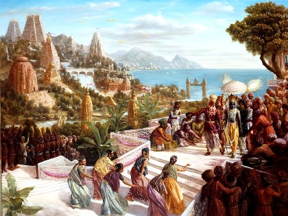 Quase todos os palácios eram arranha-céus. Em cada e toda casa havia grandes potes de ouro e prata e cereais armazenados em salões subterrâneos. E havia muitos potes de ouro com água dentro dos aposentos. Os quartos de dormir eram todos incrustrados com jóias, e os pisos eram pavimentos de mosaico feitos com jóias marakata. A Deidade de Vishnu, adorada pelos descendentes da dinastia Yadu, estava instalada em cada casa da cidade. Os quarteirões residenciais eram organizados para que as diferentes castas, brahmanas, kshatriyas, vaishyas e shudras, tivessem seus quarteirões respectivos. Assim parece que o sistema de casta existia já naquele tempo. No centro da cidade, havia outro quarteirão residencial feito especialmente para o rei Ugrasena. Esse lugar era a casa mais brilhante de todas as casas. Quando os semideuses viram que Krishna construía uma cidade particular da Sua própria escolha, enviaram a célebre flor parijata do planeta celestial para ser plantada na nova cidade, e também enviaram uma casa de parlamento, Sudharma. A qualidade específica dessa casa de assembléia era que qualquer pessoa que participasse de uma reunião dentro dela superava a influência da invalidez devido à velhice. O semideus Varuna também presenteou um cavalo, que era todo branco com exceção das orelhas pretas e que podia correr à velocidade da mente. Kuvera, o tesoureiro dos semideuses, presenteou a arte de obter os oito estágios de opulências materiais. Dessa forma, todos os semideuses começaram a presentear seus presentes respectivos de acordo com suas respectivas capacidades. Existem trinta e três milhões de semideuses, e a cada um deles é confiado um departamento da administração universal. Todos os semideuses aproveitaram a oportunidade da Suprema Personalidade de Deus construir a cidade de Sua própria escolha para presentear seus presentes respectivos, o que tornou a cidade de Mathura única no universo. Isso prova que há inumeráveis semideuses, porém nenhum deles é independente de Krishna. Como está afirmado no Sri Chaitanya Charitamrita, Krishna é o mestre supremo, e todos os outros são Seus servos. Assim todos os servos aproveitaram a oportunidade de render serviço a Krishna quando Ele estava presente pessoalmente neste universo. Esse exemplo deve ser seguido por todos, especialmente aqueles que são conscientes de Krishna, porque devem servir Krishna com suas habilidades respectivas. Quando a cidade foi inteiramente construída de acordo com o plano, Krishna transferiu todos habitantes de Mathura e encarregou Sri Balarama de ser o pai da cidade. Depois disso Ele consultou Balarama, e com um colar de flores de lótus, Ele saiu da cidade para encontrar Kalayavana, que já tinha sitiado Mathura sem empunhar nenhuma arma. Quando Krishna saiu da cidade, Kalayavana, que nunca viu Krishna antes, pôde ver que Ele era extraordinariamente belo, vestido com roupas amarelas. Ao passar por Sua assembléia de soldados, Krishna parecia a Lua no céu que passa através da assembléia de nuvens. Kalayavana foi afortunado bastante para ver as linhas de Shrivatsa, uma impressão particular no peito de Sri Krishna, e a jóia Kaustubha que Ele usava. Kalayavana O viu, entretanto, em Sua forma de Vishnu, com um corpo bem construído, com quatro mãos, e olhos iguais a pétalas de lótus recém-desabrochadas. Krishna parecia bem-aventurado, com uma linda fronte e bela face, com olhos sorridentes inquietos e brincos em movimento. Antes de ver Krishna, Kalayavana ouviu sobre Ele de Narada, e agora as descrições de Narada foram confirmadas. Ele observou as marcas específicas de Krishna e as jóias em Seu peito, Seu belo colar de flores de lótus, Seus olhos iguais ao lótus e belas características corpóreas similares. Ele concluiu que essa bela personalidade devia ser Vasudeva, porque cada descrição de Narada que ele ouviu previamente foi substanciada pela presença de Krishna. Kalayavana ficou muito espantado de ver que Ele passava sem nenhuma arma em Suas mãos e sem nenhuma quadriga. Ele simplesmente andava a pé. Kalayavana veio lutar com Krishna, mesmo assim tinha princípios suficientes para não pegar nenhum tipo de arma. Ele decidiu lutar com Ele de mão a mão. Assim ele se preparou para capturar Krishna e lutar. Krishna, entretanto, foi em frente sem olhar para Kalayavana, e Kalayavana começou a segui-Lo com o desejo de capturá-Lo. Porém apesar de toda sua corrida rápida, ele não pôde capturar Krishna. Krishna não pode ser capturado mesmo pela velocidade mental atingida pelos grandes yogis. Ele só pode ser capturado por serviço devocional, e Kalayavana não tinha prática com serviço devocional. Ele queria capturar Krishna, e como não conseguia fazer isso, ele O seguia por trás. Kalayavana começou a correr muito rápido, e ele pensava, "agora estou mais perto; vou capturá-Lo", mas ele não conseguia. Krishna o deixou bem longe, e entrou numa caverna dentro de uma montanha. Kalayavana pensou que Krishna tentava evitar a luta com ele por isso tinha Se abrigado numa caverna. Ele começou a repreendê-Lo com as seguintes palavras: "Ó Você, Krishna! Eu ouvi que Você é um grande herói nascido na dinastia Yadu, porém eu vejo que Você está correndo mesmo da luta, como um covarde. Isso não é digno de Seu bom nome e tradição familiar". Kalayavana O seguia, corria muito rápido, ainda assim não conseguia capturar Krishna porque não estava livre de todas as contaminações da vida pecaminosa. De acordo com a cultura Védica, qualquer pessoa que viva sem seguir os princípios reguladores da vida observados pelas castas superiores como os brahmanas, kshatriyas, vaishyas e mesmo a classe trabalhadeira é chamada mleccha. A situação social Védica é planejada de tal forma que pessoas que são aceitas como shudras podem gradualmente se elevar à posição de brahmanas pelo avanço cultural conhecido como samskara, ou processo purificatório. A versão da