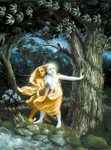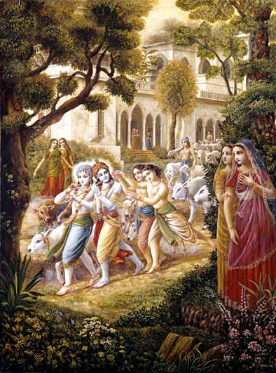 As gopis então oraram para Krishna, "Querido Krishna, do Seu umbigo emana a flor de lótus original que é o local de nascimento de Brahma, o criador. Ninguém pode estimar Suas glórias ou Sua opulência, que assim permanece sempre um mistério mesmo para homens altamente meticulosos, os mestres de todo o poder do yoga. A alma condicionada caída no poço escuro desta existência material pode muito facilmente, entretanto, abrigar-se nos pés de lótus do Senhor Krishna. Assim sua liberação está garantida". As gopis continuaram: "Querido Krishna, nós estamos sempre ocupadas em nossos afazeres familiares. Nós por isso pedimos que Você permaneça dentro de nossos corações como o Sol nascente, e essa será Sua maior bênção". As gopis são sempre almas liberadas, porque elas são plenamente conscientes de Krishna. Elas só pretendiam estar entretidas com os afazeres domésticos em Vrindavana. Apesar de sua longa separação, os habitantes de Vrindavana, as gopis, não estavam interessados na idéia de irem com Krishna para Sua cidade capital, Dwaraka. Eles queriam permanecer ocupados em Vrindavana e assim sentirem a presença de Krishna em cada passo de suas vidas. Eles imediatamente convidaram Krishna para voltar a Vrindavana. Essa existência emocional transcendental das gopis é o princípio básico do ensinamento do Senhor Chaitanya. O Festival Ratha-yatra observado pelo Senhor Chaitanya é o processo emocional de levar Krishna de volta para Vrindavana. Srimati Radharani Se recusou a ir com Krishna para Dwaraka para desfrutar Sua companhia na atmosfera da opulência real, mas queria desfrutar a companhia Dele na atmosfera original de Vrindavana. O Senhor Krishna, por ser profundamente apegado às gopis, nunca vai embora de Vrindavana, e as gopis e outros residentes de Vrindavana permanecem plenamente satisfeitos em Consciência de Krishna.