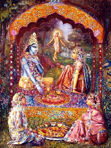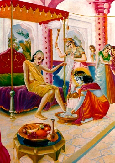 O Senhor Krishna, a Superalma, sabe tudo dentro do coração de todos. Ele sabe a determinação de todos e a necessidade de todos. Ele sabia, portanto, a razão da vinda de Sudama Vipra até Ele. Ele sabia que levado por extrema pobreza, ele foi até lá a pedido de sua esposa. Assim pensava em Sudama como Seu muito querido amigo de classe, Ele sabia que o amor de Sudama por Ele como amigo nunca foi manchado por nenhum desejo por benefício material. Krishna pensou, "Sudama não veio Me pedir nada, mas foi obrigado pelo pedido de sua esposa, ele veio Me ver justamente para agradá-la". O Senhor Krishna então decidiu que Ele daria mais opulência material a Sudama Vipra do que pode ser imaginado mesmo pelo Rei do céu. Ele então pegou o fardo de arroz partido que estava pendurado no ombro do pobre brahmana, embrulhado no canto de sua capa, e disse, "O que é isso? Meu querido amigo, você trouxe para Mim ótimo, delicioso arroz partido"! Ele encorajou Sudama Vipra, ao dizer, "Eu considero que esta quantidade de arroz partido não somente Me satisfaz, mas satisfará a criação inteira". É entendido desta declaração que Krishna, a fonte original de tudo, é a raiz da criação inteira. Pôr água na raiz duma árvore imediatamente distribui água para cada parte da árvore, assim uma oferenda feita para Krishna, ou qualquer ação feita para Krishna, é considerado o trabalho mais elevado de bem-estar para todos, porque o benefício dessa oferenda é distribuído em toda parte da criação. O amor por Krishna se torna distribuído para todos os seres vivos. Enquanto o Senhor Krishna falava com Sudama Vipra, Ele comeu um punhado de arroz partido do fardo dele, e quando Ele tentou comer um segundo punhado, Rukminidevi, que é a deusa da fortuna em pessoa, impediu o Senhor por segurar Sua mão. Depois de tocar a mão de Krishna, Rukmini disse, "Meu querido Senhor, esse único punhado de arroz partido é suficiente para causar a ele que o ofereceu se tornar muito opulento e continuar sua opulência na próxima vida. Meu Senhor, Você é tão bom com Seu devoto que mesmo esse pequeno punhado de arroz partido O satisfaz muito grandemente, e o Seu prazer assegura ao devoto opulência tanto nesta vida quanto na próxima". Isso indica que quando o alimento é oferecido ao Senhor Krishna com amor e devoção e Ele fica satisfeito e aceita do devoto, Rukminidevi, a deusa da fortuna, fica tão agradecida ao devoto que ela tem de ir pessoalmente ao lar do devoto para transformá-lo no lar mais opulento no mundo. Se alguém alimenta Narayana suntuosamente, a deusa da fortuna, Lakshmi, automaticamente se torna uma convidada no lar da pessoa, isso quer dizer que o lar da pessoa se torna opulento. O brahmana erudito Sudama passou a noite na casa do Senhor Krishna, e enquanto ele estava lá, sentiu como se vivesse num planeta Vaikuntha. Na realidade, ele estava vivendo em Vaikuntha, porque onde quer que o Senhor Krishna, o Narayana original, e Rukminidevi, a deusa da fortuna, vivem não é diferente do planeta espiritual, Vaikunthaloka.