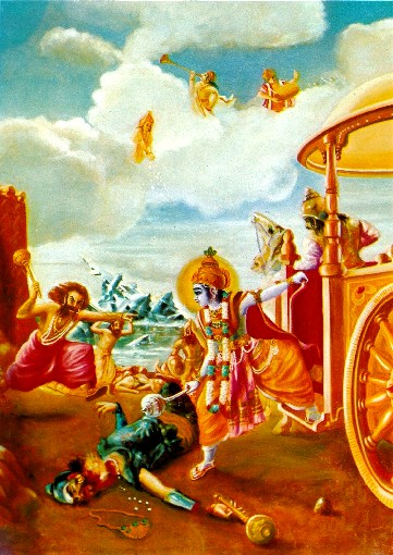 Depois da morte de Shishupala, Shalva e Paundra, outro demônio tolo de nome Dantavakra queria matar Krishna a fim de vingar a morte de Seu amigo Shalva. Ele ficou tão perturbado que apareceu pessoalmente no campo de batalha sem armas e munições próprias e sem nem mesmo uma quadriga. Sua única arma era sua grande ira, que era em brasa. Ele carregava somente uma maça em sua mão, mas ele era tão poderoso que quando movia, todo mundo sentia a terra tremer. Quando o Senhor Krishna o viu se aproximando num humor muito heróico, Ele imediatamente desceu de Sua quadriga, pois era regra da etiqueta militar que o combate deveria acontecer somente entre iguais. Por saber que Dantavakra estava sozinho e armado só com uma maça, o Senhor Krishna respondeu similarmente e Se preparou por pegar Sua maça em Sua mão. Quando Krishna apareceu na frente dele, a marcha heróica de Dantavakra foi imediatamente parada justamente igual as grandes e furiosas ondas do oceano são paradas pela praia. Naquela hora, Dantavakra, que era o Rei de Karusha, posicionou-se firmemente com sua maça e falou para o Senhor Krishna como se segue: "É um grande prazer e uma oportunidade afortunada, Krishna, que encaramos um o outro olho no olho. Meu querido Krishna, depois de tudo, Você é meu primo eterno, e eu não deveria matá-Lo dessa forma, mas infelizmente Você cometeu um grande erro ao matar meu amigo Shalva. Além do mais, Você não está satisfeito em matar meu amigo, porém eu sei que Você quer me matar também. Por causa da Sua determinação, eu tenho que matá-Lo assim vou despedaçá-Lo em pedaços com minha maça. Krishna, apesar de Você ser meu parente, Você é um tolo. Você é nosso maior inimigo, por isso eu tenho que matá-Lo hoje justamente igual uma pessoa remove um furúnculo de seu corpo com uma operação cirúrgica. Eu sou sempre muito grato a meus amigos, e por isso eu me considero em dívida com meu amigo Shalva. Eu só posso liquidar minha dívida com ele por matar Você". Da mesma forma que um tratador de elefante tenta controlar o animal por espetá-lo com seu tridente, assim Dantavakra tentou controlar Krishna simplesmente por falar palavras duras. Depois de finalizar sua vituperação, ele golpeou Krishna na cabeça com sua maça e fez um som de rugido igual um leão. Apesar de golpeado fortemente pela maça de Dantavakra, Krishna não Se moveu nem um centímetro, nem Ele sentiu nenhuma dor. Com Sua maça Kaumodaki em punho e movendo-a com muita destreza, Krishna golpeou o tórax de Dantavakra tão furiosamente que o coração de Dantavakra partiu em dois. Em resultado, Dantavakra começou a vomitar sangue, seus cabelos ficaram desgrenhados, e ele caiu no chão, com suas mãos e pernas espalhadas. Em apenas poucos minutos, tudo o que restou de Dantavakra era somente um corpo morto no chão. Depois da morte de Dantavakra, justamente igual ao momento da morte de Shishupala, na presença de todas pessoas presentes ali, uma pequena partícula de refulgência espiritual saiu do corpo do demônio e muito maravilhosamente imergiu no corpo do Senhor Krishna. Dantavakra tinha um irmão chamado Viduratha que ficou transtornado de pesar com a morte de Dantavakra. Por causa da dor e ira, Viduratha respirava muito pesadamente, e justamente para vingar a morte de seu irmão ele também apareceu perante o Senhor Krishna com uma espada e escudo em suas mãos. Ele queria matar Krishna imediatamente. Quando o Senhor Krishna entendeu que Viduratha procurava a oportunidade para atacá-Lo com sua espada, Ele empregou Seu Sudarshana-chakra, Seu disco, que era mais afiado do que uma navalha, e sem demora, Ele cortou a cabeça de Viduratha, com seu elmo e brincos. Dessa forma, depois de matar Shalva e destruir seu maravilhoso aeroplano e depois de matar Dantavakra e Viduratha, o Senhor Krishna finalmente entrou em Sua cidade, Dwaraka. Não teria sido possível para ninguém mais além de Krishna matar esses grandes heróis, e por isso, todos os semideuses do céu e seres humanos na superfície do globo O glorificavam. Grandes sábios e ascetas, cidadãos dos planetas Siddha e Gandharva, os cidadãos conhecidos como Vidyadharas, Vasuki e Mahanagas, os belos anjos, os habitantes de Pitriloka, os Yakshas, os Kinnaras e os Charanas todos começaram a chover flores sobre Ele e cantar as canções da Sua vitória em grande júbilo. Depois de decorarem a cidade inteira muito festivamente, os cidadãos de Dwaraka fizeram uma grande celebração, e quando o Senhor Krishna passou através da cidade, todos os membros da dinastia Vrishni e os heróis da dinastia Yadu O seguiram com grande respeito. Esses são alguns dos passatempos transcendentais do Senhor Krishna, que é o mestre de todo poder místico e o Senhor de todas as manifestações cósmicas. Aqueles que são tolos, que são iguais a animais, às vezes acham que Krishna é derrotado, mas na realidade Ele é a Suprema Personalidade de Deus, ninguém pode derrotá-Lo. Ele sempre permanece vitorioso sobre todos. Ele é o único Deus, e todos os outros são Seus subservientes cumpridores de ordens. Certa vez, o Senhor Balarama ouviu que havia um arranjo em andamento para uma luta entre os dois partidos rivais na dinastia Kuru, um liderado por Duryodhana e o outro pelos Pandavas. Ele não gostou da idéia que Ele deveria ser somente um mediador para parar a luta. Assim achou insuportável não tomar uma parte ativa em benefício de qualquer um dos partidos, Ele deixou Dwaraka com a desculpa de visitar vários lugares de peregrinação. Ele primeiro de tudo visitou o local de peregrinação conhecido como Prabhasakshetra. Ele tomou Seu banho lá, e pacificou os brahmanas locais e ofereceu oblações aos semideuses, pitas, grandes sábios e pessoas em geral, de acordo com as cerimônias ritualísticas Védicas. Assim é o método Védico de visitar os locais sagrados. Depois disso, acompanhado por alguns brahmanas respeitáveis, Ele decidiu visitar diferentes
