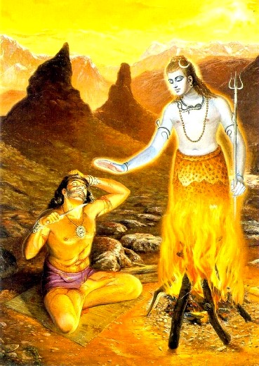 O demônio foi salvo de cometer suicídio pelo toque do Senhor Shiva; suas feridas corpóreas imediatamente curaram, e seu corpo se tornou como era antes. Então o Senhor Shiva disse ao demônio, "Meu querido Vrikasura, você não precisa cortar sua cabeça. Você pode pedir para mim qualquer bênção que deseje, e eu satisfarei o seu desejo. Eu não sei porque você queria cortar sua cabeça para me satisfazer. Eu me torno satisfeito mesmo com a oferenda de um pouco de água". Na realidade, de acordo com o processo Védico, o Shiva linga no templo ou a forma do Senhor Shiva no templo é adorada simplesmente por oferecer água do Ganges porque é dito que o Senhor Shiva fica grandemente satisfeito quando água do Ganges é derramada sobre sua cabeça. Geralmente, devotos oferecem água do Ganges e folhas da árvore bilva, que são especialmente destinadas para oferecer ao Senhor Shiva e à deusa Durga. A fruta dessa árvore também é oferecida ao Senhor Shiva. O Senhor Shiva assegurou Vrikasura que ele fica satisfeito com um processo de adoração muito simples. Por que então ele estava tão ansioso para cortar sua cabeça, e por que ele se sujeitou a tamanha dor por cortar seu corpo em pedaços e oferecer ao fogo? Não havia necessidade de penitências tão severas. De qualquer forma, por compaixão e solidariedade, o Senhor Shiva preparou para dar a ele qualquer bênção ele quisesse. Quando o demônio foi oferecido essa facilidade pelo Senhor Shiva, ele pediu uma bênção temível e abominável. O demônio era muito pecaminoso, e pessoas pecaminosas não sabem que tipo de bênção deve ser pedida à deidade. Assim ele pediu ao Senhor Shiva para ser abençoado com poder tamanho para assim que ele tocasse a cabeça de qualquer um, ela iria imediatamente rachar, e o homem morreria. Os demônios são descritos no Bhagavad-gita como duskrtinas, ou malfeitores. Krti significa muito meritório, mas quando dus, é acrescentado, significa abominável. Em vez de se renderem à Suprema Personalidade de Deus, os duskrtinas adoram diferentes semideuses a fim de obter benefícios materiais abomináveis. Às vezes esses demônios na forma de cientistas materiais descobrem armas letais. Eles não podem mostrar seu poder meritório por descobrir algo que possa salvar o homem da morte, mas em vez disso eles descobrem armas que podem acelerar o processo da morte. Porque o Senhor Shiva é poderoso o bastante para dar qualquer bênção, o demônio poderia ter pedido a ele algo benéfico para a sociedade humana, mas para seu interesse pessoal ele pediu para qualquer um cuja cabeça fosse tocada por sua mão morreria imediatamente. O Senhor Shiva pôde entender o motivo do demônio, e ficou muito triste que tinha assegurado a ele qualquer bênção que desejasse. Ele não quebraria sua promessa, mas ficou muito triste em seu coração porque tinha que oferecer a ele uma bênção tão perigosa para a sociedade humana. Os demônios são descritos como duskrtinas, malfeitores, porque apesar de terem poder cerebral e mérito, o mérito e poder cerebral são usados para atividades abomináveis. Às vezes, por exemplo, os demônios materialistas descobrem uma arma letal. A pesquisa científica para uma descoberta dessa certamente requer um cérebro muito bom, mas em vez de descobrir algo benéfico para a sociedade humana, eles descobrem algo para acelerar a morte que já é assegurada para cada humano. Similarmente, Vrikasura, em vez de pedir ao Senhor Shiva algo benéfico para a sociedade humana, pediu algo muito perigoso para a sociedade humana. Por isso o Senhor Shiva se sentiu triste dentro de si mesmo. Devotos da Personalidade de Deus, entretanto, nunca pedem nenhuma bênção ao Senhor Vishnu ou Krishna, e mesmo se pedem algo para o Senhor, não é de jeito nenhum perigoso para a sociedade humana. Essa é a diferença entre demônios e devotos, ou os adoradores do Senhor Shiva e os adoradores do Senhor Vishnu. Enquanto Shukadeva Goswami narrava a história de Vrikasura, ele chamou Maharaja Parikshit de Bharata, por se referir ao nascimento do Rei Parikshit numa família de devotos. Maharaja Parikshit foi salvo pelo Senhor Krishna enquanto estava no ventre da mãe. Similarmente, ele poderia ter pedido ao Senhor Krishna para salvá-lo da maldição do brahmana, mas ele não fez isso. O demônio, entretanto, queria se tornar imortal por matar todos com o toque da sua mão. O Senhor Shiva pôde entender isso, mas porque tinha prometido, deu-lhe a bênção. O demônio, entretanto, porque era muito pecaminoso, imediatamente decidiu que usaria a bênção para matar o Senhor Shiva e levar Gauri (Parvati) para seu desfrute pessoal. Ele imediatamente decidiu pôr sua mão sobre a cabeça do Senhor Shiva. Assim o Senhor Shiva foi posto numa situação desastrosa porque estava em perigo por sua própria bênção para um demônio. Isso é outro exemplo de devoto materialista que mal usa o poder obtido dos semideuses. Sem mais deliberação, o demônio Vrikasura imediatamente se aproximou do Senhor Shiva para pôr sua mão na cabeça do Senhor Shiva. O Senhor Shiva ficou com tanto medo dele que seu corpo tremeu, e ele começou a fugir da terra para o céu e do céu para outros planetas até que atingiu os limites do universo, acima dos sistemas planetários superiores. O Senhor Shiva fugiu de um lugar para outro, mas o demônio Vrikasura continuou a persegui-lo. As deidades predominantes dos outros planetas, tais quais Brahma, Indra e Chandra, não conseguiam achar um modo para salvar o Senhor Shiva do perigo iminente. Onde quer que o Senhor Shiva ia, eles permaneciam em silêncio. Por último, o Senhor Shiva se aproximou do Senhor Vishnu, que está situado dentro deste universo no planeta conhecido como Swetadwipa. Swetadwipa é o planeta Vaikuntha local além da jurisdição da influência da energia externa. O Senhor Vishnu em Seu aspecto todo-penetrante permanece em toda parte, mas onde Ele permanece pesso