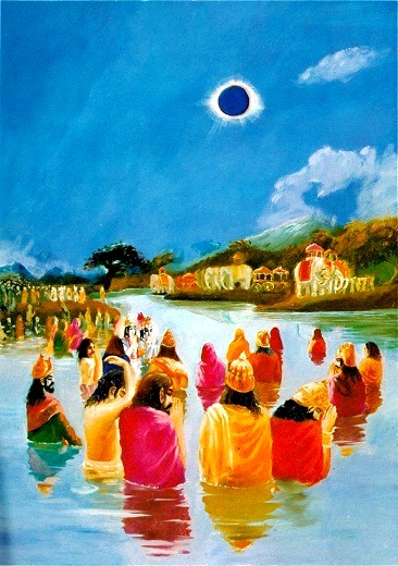 Certa vez enquanto o Senhor Krishna e Balarama viviam pacificamente em Sua grande cidade de Dwaraka, houve uma ocasião rara de um eclipse solar total, como acontece no fim de cada kalpa, ou dia de Brahma. No fim de cada kalpa, o Sol é coberto por uma grande nuvem, e chuva incessante cobre os sistemas planetários inferiores até Swargaloka. Por cálculo astronômico, as pessoas estavam informadas sobre esse grande eclipse antes de acontecer, assim todos, homens e mulheres, decidiram se reunir no local sagrado em Kurukshetra conhecido como Samanta-pañchaka. O lugar de peregrinação Samanta-pañchaka é célebre porque o Senhor Parashurama realizou grandes sacrifícios ali depois de matar todos os kshatriyas do mundo vinte e uma vezes. . O Senhor Parashurama matou todos os kshatriyas, e o sangue acumulado deles fluía igual um córrego. O Senhor Parashurama cavou cinco grandes lagos em Samanta-pañchaka e os encheu com esse sangue. O Senhor Parashurama é Vishnu-tattva. Como está afirmado no Ishopanishad, Vishnu-tattva não pode ser contaminado por nenhuma atividade pecaminosa. E apesar do Senhor Parashurama ser plenamente poderoso e incontaminado, a fim de exibir caráter ideal, Ele realizou grandes sacrifícios em Samanta-pañchaka para expiar Sua dita matança pecaminosa dos kshatriyas. Pelo Seu exemplo, o Senhor Parashurama estabeleceu que a arte de matar, apesar de ser necessária às vezes, não é boa. O Senhor Parashurama considerou-Se culpado pela matança pecaminosa dos kshatriyas; portanto, o quanto mais nós somos culpados por esses atos abomináveis não sancionados. Assim, matança de seres vivos é proibida desde tempo imemorável por todo o mundo. Para aproveitar a oportunidade da ocasião do eclipse solar, todas as pessoas importantes visitaram o lugar sagrado de peregrinação. Algumas das personalidades importantes são mencionadas como se segue. Entre as pessoas mais idosas estavam Akrura, Vasudeva e Ugrasena; entre a jovem geração estavam Gada, Pradyumna, Samba, e muitos outros membros da dinastia Yadu que foram até lá com uma vista para expiar as atividades pecaminosas acumuladas no curso do cumprimento de seus respectivos deveres. Porque quase todos os membros da dinastia Yadu foram para Kurukshetra, algumas personalidades importantes, tais quais Aniruddha, o filho de Pradyumna, e Kritavarma, o comandante chefe da dinastia Yadu, juntos com Suchandra, Shuka e Sarana, ficaram em Dwaraka para proteger a cidade. Todos os membros da dinastia Yadu eram naturalmente muito belos, mesmo assim nessa ocasião, quando apareceram devidamente decorados com colares de ouro e colares de flores, vestidos com roupas valiosas e propriamente armados com seus armamentos respectivos, sua beleza natural e personalidades foram incrementadas cem vezes. Os membros da dinastia Yadu vieram a Kurukshetra em quadrigas decoradas de forma deslumbrante que pareciam aeroplanos dos semideuses; puxadas por grandes cavalos que se moviam como as ondas do oceano, e alguns deles superavam elefantes vigorosos e robustos que se moviam como nuvens no céu. Suas esposas eram carregadas em belos palanquins por homens belos cujas características pareciam as dos Vidyadharas. A assembléia inteira parecia tão bela quanto uma assembléia dos semideuses no céu. Depois de chegar a Kurukshetra, os membros da dinastia Yadu tomaram seus banhos cerimoniosamente, com autocontrole, como ordenado nos shastras, e eles observaram jejum por todo o período do eclipse a fim de nulificar as reações de suas atividades pecaminosas. Porque é costume Védico dar caridade ao máximo possível durante as horas do eclipse, os membros da dinastia Yadu distribuíram muitas centenas de vacas em caridade aos brahmanas. Todas essas vacas eram plenamente decoradas com tecidos finos e ornamentos. A característica especial dessas vacas é que elas tinham guizos de tornozelo de ouro e colares de flores em seus pescoços.