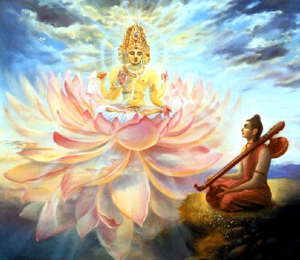 Natureza e os seres vivos são às vezes designados como prakrti e purusa respectivamente. A manifestação cósmica toda é uma amalgamação do prakrti e purusa. Natureza é a causa ingrediente, e os seres vivos são a causa efetiva. Essas duas causas combinam juntas, e o efeito é esta manifestação cósmica. Quando uma pessoa é afortunada o bastante para chegar à conclusão certa sobre esta manifestação cósmica e tudo que acontece dentro dela, sabe que ela é causada direta e indiretamente pela Suprema Personalidade de Deus em Pessoa. É concluído no Brahma-samhita, portanto, isvarah paramah krsnah sat-cid-ananda-vigrahah anadir adir govindah sarva-karana-karanam. Depois de muita deliberação e consideração, quando a pessoa atinge a perfeição do conhecimento, chega à conclusão que Krishna, ou Deus, é a causa original de todas as causas. Em vez de especular sobre a medição de Deus - se Ele é tão comprido e tão largo - ou filosofar, a pessoa tem que chegar à conclusão do Brahma-samhita: sarva-karana-karanam: "Krishna, ou Deus, é a causa de todas as causas". Essa é a perfeição do conhecimento. Assim o Veda-stuti, ou as preces oferecidas pelos Vedas personificados ao Garbhodakashayi Vishnu, foi narrado primeiramente na sucessão discipular por Sanandana a seus irmãos, todos os quais nasceram de Brahma. No início, os quatro Kumaras foram os primeiros a nascer de Brahma; portanto eles são conhecidos como purva-jata. É afirmado no Bhagavad-gita que o sistema parampara, ou a sucessão discipular, começa com o Próprio Krishna. Similarmente, aqui, nas preces dos Vedas personificados, deve-se entender que o sistema parampara começa com a Personalidade de Deus Narayana Rishi. Devemos lembrar que este Veda-stuti é narrado por Kumara Sanandana, e a narração é repetida por Narayana Rishi em Bodi Ashrama. Narayana Rishi é a encarnação de Krishna para nos mostrar o caminho da auto-realização por se submeter a severas austeridades. Nesta era, o Senhor Chaitanya demonstrou o caminho do serviço devocional por Se colocar no papel de um devoto puro. Similarmente, no passado, o Senhor Narayana Rishi foi uma encarnação de Krishna que realizou severas austeridades na cordilheira Himalaia. Sri Narada Muni ouvia Dele. Assim, na declaração dada por Narayana Rishi a Narada Muni, como foi narrada por Kumara Sanandana na forma do Veda-stuti, entende-se que Deus é o supremo único e todos os outros são Seus serventes. No Chaitanya Charitamrita está afirmado, ekala isvara krsna: "Krishna é o único Deus supremo". Ara sarva bhrtya: "Todos os outros são Seus servos". Yare yaiche nacaya, sa taiche kare nrtya: "O Supremo Senhor, do modo que Ele deseja, engaja todos os seres vivos em diferentes atividades, e assim eles exibem seus diferentes talentos e tendências". Este Veda-stuti assim é a instrução original a respeito da relação que existe entre o ser vivo e a Suprema Personalidade de Deus. A mais alta plataforma de realização para o ser vivo é a realização de sua vida devocional. Ninguém pode se dedicar à vida devocional ou Consciência de Krishna a menos que seja plenamente livre da contaminação material. Narayana Rishi informou Narada Muni que a essência de todos os Vedas e literaturas Védicas (chamadas, os quatro Vedas, os Upanishads, os Puranas) ensinam a rendição de serviço amoroso devocional ao Senhor. Nessa conexão, Narayana Rishi usou uma palavra particular - rasa. No serviço devocional, esse rasa é a via mídia pela qual ou o princípio básico para intercambiar uma relação entre o Senhor e o ser vivo. Um rasa também é descrito nos Vedas como isavasya: "O Supremo Senhor é o reservatório de todo prazer". Todas as literaturas Védicas, os Puranas, os Vedas, os Upanishads, os Vedanta-sutras, etc., ensinam os seres vivos como alcançarem o estágio de rasa. O Bhagavatam também diz que as declarações do Mahapurana (Srimad Bhagavatam) contêm os rasas essenciais em todas as literaturas Védicas. Nigama-kalpa-taror galitam phalam. O Bhagavatam é a essência do fruto maduro na árvore da literatura Védica. Nós entendemos que com a respiração da Suprema Personalidade de Deus foram emitidos os quatro Vedas, chamados o Rg-veda, o Sama-veda, Yajur-veda, e o Atharva-veda, e as histórias tais quais o Mahabharata e todos os Puranas, que também são consideradas como a história do mundo. As histórias Védicas como os Puranas e Mahabharata são chamadas de o quinto Veda. Os versos do Veda-stuti são considerados a essência de todo conhecimento Védico. Os quatro Kumaras e todos os outros sábios sabem perfeitamente que serviço devocional em Consciência de Krishna é a essência de todas literaturas Védicas, e todos eles pregam isso em diferentes planetas, em viagens pelo espaço sideral. Está afirmado aqui que esses sábios, inclusive Narada Muni, raramente viajam por terra; eles viajam perpetuamente pelo espaço. Sábios iguais a Narada e os Kumaras viajam por todo o universo a fim de educar as almas condicionadas e mostrar a elas que sua ocupação neste mundo não é a do prazer sensual, e sim restabelecerem-se novamente em sua posição original do serviço devocional para a Suprema Personalidade de Deus. É dito em vários lugares que os seres vivos são como fagulhas no fogo, e a Suprema Personalidade de Deus é o próprio fogo em si. De alguma forma ou de outra, quando as fagulhas caem do fogo, perdem sua iluminação natural; assim é comprovado que os seres vivos vêm a este mundo material exatamente igual fagulhas caem de um grande fogo. O ser vivo quer imitar Krishna e tenta dominar a natureza material; assim ele esquece sua posição original, e seu poder de iluminação, sua identidade espiritual, é extinto. Entretanto, se um ser vivo adota a Consciência de Krishna, ele é restabelecido em sua posição original. Sábios e santos iguais a Narada e os Kumaras viajam por todo o universo para educar pessoas e encoraja