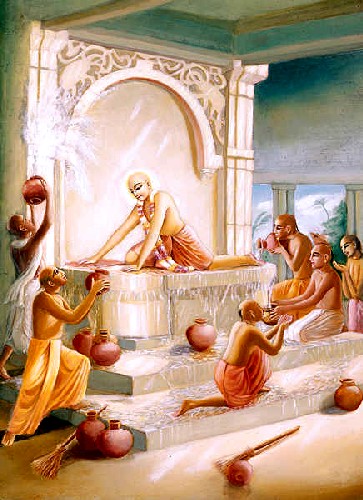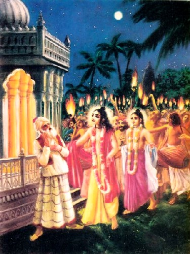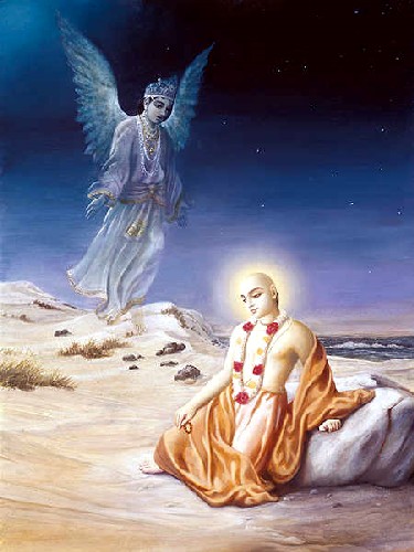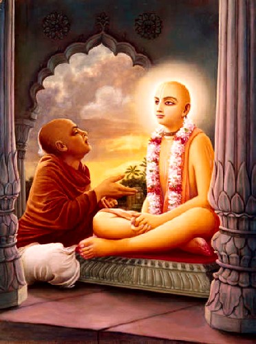Depois de ouvir a explicação do verso atmarama do Senhor, o Bhattacharya se convenceu que uma apresentação tão erudita assim é impossível para uma criatura terrestre. Anteriormente, Sri Gopinatha Acharya tentou convencê-lo da divindade do Senhor, mas naquele momento, ele não pôde aceitá-Lo dessa forma. Mas o Bhattacharya ficou surpreendido com a exposição do Senhor sobre o Vedanta-sutra e as explicações sobre o sloka atmarama, e assim ele começou a pensar que tinha cometido uma grande ofensa aos pés de lótus do Senhor por não reconhecê-Lo como o Próprio Krishna em pessoa. Então, ele se rendeu ao Senhor, muito arrependido pelo seu comportamento anterior com Ele, e o Senhor foi bondoso o bastante para aceitar o Bhattacharya. Por Sua misericórdia sem causa, o Senhor manifestou perante ele primeiro Sua forma de Narayana com quatro braços e depois novamente o Senhor Krishna de duas mãos com uma flauta em Sua mão. O Bhattacharya então caiu imediatamente aos pés de lótus do Senhor e compôs muitos slokas em louvor ao Senhor por Sua graça. Ele compôs quase cem slokas em louvor ao Senhor. O Senhor então o abraçou, e por causa do êxtase transcendental, o Bhattacharya perdeu a consciência do estado físico da vida. Lágrimas, tremor, palpitação do coração, transpiração, ondas emocionais, dançar, cantar e chorar, e todos os oito sintomas de transe se manifestaram no corpo do Bhattacharya. Sri Gopinatha Acharya ficou muito feliz e admirado com essa conversão maravilhosa do seu cunhado pela graça do Senhor. |