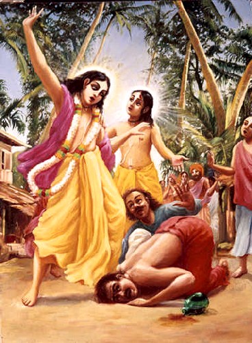 Certa vez, Nityananda Prabhu e Srila Haridasa Thakura andavam por uma rua principal, e viram no caminho uma multidão reunida em alvoroço. Depois de perguntarem a transeuntes, entenderam que os dois irmãos, chamados Jagai e Madhai, causavam uma perturbação pública em estado de embriaguez. Eles também ouviram que esses dois irmãos nasceram numa família brahmana respeitável, mas por causa de companhia inferior, eles se transformaram em libertinos do pior tipo. Eles não eram somente bêbados mas também comedores de carne, caçadores de mulheres, dacoits (ladrões) e pecadores de toda espécie. Srila Nityananda Prabhu ouviu todas essas histórias e decidiu que essas duas almas caídas deveriam ser as primeiras a serem liberadas. Se eles fossem liberados de suas vidas pecaminosas, então o bom nome do Senhor Chaitanya seria glorificado mais ainda. Com essa idéia, Nityananda Prabhu e Haridasa abriram seu caminho na multidão e pediram aos dois irmãos para cantarem o santo nome do Senhor Hari. Os irmãos bêbados ficaram irritados com esse pedido e atacaram Nityananda Prabhu com linguagem obscena. Os dois irmãos os seguiram por uma distância considerável. À noite, o relato do trabalho de pregação foi submetido ao Senhor, e Ele ficou feliz de saber que Nityananda e Haridasa tentaram liberar aquele par de sujeitos estúpidos. No dia seguinte, Nityananda Prabhu foi ver os dois irmãos, e logo que Se aproximou, um deles atirou um pedaço de pote de barro Nele. Isso acertou Sua testa, e o sangue começou a jorrar imediatamente. Mas Nityananda Prabhu era tão bom que em vez de protestar contra esse ato hediondo, Ele disse, "não importa que vocês atiraram esta pedra em Mim. Eu ainda peço para vocês cantarem o santo nome do Senhor Hari". Um dos irmãos, Jagai, ficou admirado de ver o comportamento de Nityananda Prabhu, e caiu a Seus pés imediatamente e pediu a Ele que perdoasse seu irmão pecaminoso. Quando Madhai tentou ferir Nityananda Prabhu novamente, Jagai o impediu e implorou que ele caísse aos pé Dele. Nesse momento, a notícia do ferimento de Nityananda chegou ao Senhor, que imediatamente partiu para o local num humor feroz e furioso. O Senhor invocou imediatamente Sua sudarshana-chakra, (a arma suprema do Senhor, que tem forma parecida com uma roda) para matar os pecadores, mas Nityananda Prabhu lembrou o Senhor sobre Sua missão. A missão do Senhor era liberar as almas caídas sem esperança de Kali-yuga, e os irmãos Jagai e Madhai eram dois exemplos típicos dessas almas caídas. Noventa por cento da população desta Era parece com esses irmãos, apesar de alto nascimento e respeitabilidade mundana. Segundo o veredito das escrituras reveladas, a totalidade da população do mundo nesta Era será da qualidade shudra mais baixa, ou mesmo mais baixa ainda. Deve-se notar que Sri Chaitanya Mahaprabhu nunca reconheceu o sistema de casta estereotipado por nascimento; em vez disso, Ele seguiu estritamente o veredito dos shastras sobre o swarupa próprio de cada um, ou identidade real. Quando o Senhor invocou Sua sudarshana-chakra e Srila Nityananda Prabhu implorou para Ele perdoar os dois irmãos, ambos os irmãos caíram aos pés de lótus do Senhor e imploraram por Seu perdão devido a seu comportamento grosseiro. O Senhor também foi solicitado por Nityananda Prabhu para aceitar essas almas arrependidas, e o Senhor concordou em aceitá-los com uma condição, que de agora em diante abandonassem suas atividades pecaminosas e hábitos depravados. Ambos os irmãos concordaram e prometeram abandonar todos seus hábitos pecaminosos, e o bondoso Senhor os aceitou e nunca mais mencionou os malfeitos passados deles.
