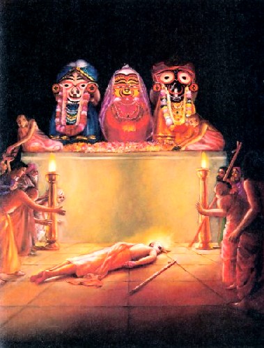 Em Puri, quando entrou no templo de Jagannatha, Ele ficou imediatamente saturado de êxtase transcendental e caiu no chão do templo inconsciente. Os zeladores do templo não podiam entender as proezas transcendentais do Senhor, mas havia um grande pandita chamado Sarvabhauma Bhattacharya, que estava presente, e pôde entender que o fato do Senhor perder Sua consciência ao entrar no templo de Jagannatha não era uma coisa comum. Sarvabhauma Bhattacharya, que era o pandita principal indicado na corte pelo rei de Orissa, Maharaja Prataparudra, ficou atraído pelo brilho juvenil do Senhor Sri Chaitanya Mahaprabhu e pôde entender que um transe transcendental desse tipo era raramente exibido, e somente pelos devotos mais elevados que já estão no plano transcendental com esquecimento completo da existência material. Somente uma alma liberada poderia exibir tal proeza, e o Bhattacharya, que era altamente erudito, pôde entender isso sob a luz da literatura transcendental com a qual era muito familiarizado. Por isso, ele pediu aos zeladores do templo para não perturbarem o sannyasi desconhecido. Ele pediu que levassem o Senhor para sua casa para que pudesse ser mais bem observado em Seu estado inconsciente. O Senhor foi levado imediatamente para a casa de Sarvabhauma Bhattacharya, que naquela época tinha poder de autoridade suficiente por ser o sabha-pandita, ou catedrático decano oficial das Literaturas em Sânscrito. O pandita erudito queria testar minuciosamente os feitos transcendentais do Senhor Chaitanya porque freqüentemente devotos inescrupulosos imitam proezas físicas com o propósito de ostentar conquistas transcendentais a fim de atrair pessoas inocentes e tirar proveito delas. Um acadêmico erudito como o Bhattacharya pode detectar esses impostores, e quando os descobre, pode rejeitá-los imediatamente. No caso do Senhor Chaitanya Mahaprabhu, o Bhattacharya testou todos os sintomas sob a luz dos shastras. Ele testou como um cientista, não como um tolo sentimentalista. Ele observou o movimento do estômago, as batidas do coração e a respiração pelas narinas. Ele também mediu o pulso do Senhor e viu que todas as Suas atividades corpóreas estavam em completa suspensão. Quando pôs uma mecha de algodão perto das narinas, ele viu que havia uma leve respiração pois as fibras finas do algodão se moviam suavemente. Assim, ele soube que o transe inconsciente do Senhor era genuíno, e começou a tratá-Lo do modo prescrito. Mas o Senhor Chaitanya Mahaprabhu só podia ser tratado de forma especial. Ele só respondia ao ressoar dos santos nomes do Senhor pelos Seus devotos. Esse tratamento especial era desconhecido por Sarvabhauma Bhattacharya porque o Senhor ainda era desconhecido para Ele. Quando o Bhattacharya O viu pela primeira vez no templo, apenas O considerou como um dos muitos peregrinos.