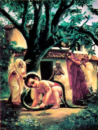 Quando o Senhor estava no colo de Sua mãe, parava de chorar imediatamente quando as senhoras que estavam em volta Dele cantavam os santos nomes e batiam palmas. Esse incidente peculiar era observado pelos vizinhos com admiração e veneração. Algumas vezes as meninas mais jovens gostavam de fazer o Senhor chorar para depois fazê-Lo parar com o canto do santo nome. Assim, desde Sua tenra infância o Senhor começou a pregar a importância do santo nome. Durante Sua infância, o Senhor Sri Chaitanya era conhecido como Nimai. Esse nome foi dado por Sua querida mãe porque o Senhor nasceu em baixo de uma árvore nimba (ou nima) no quintal de Sua casa paterna. Quando houve a oferenda de comida sólida ao Senhor com a idade de seis meses na cerimônia de anna-prasada, o Senhor indicou Suas atividades futuras. Nessa ocasião, era costume oferecer à criança moedas e livros a fim de obter alguma indicação das tendências futuras da criança. Ofereceram ao Senhor num lado as moedas e no outro, o Srimad Bhagavatam. O Senhor aceitou o Srimad Bhagavatam em vez das moedas. Quando era apenas um bebê que engatinhava no quintal, um dia apareceu uma serpente na frente do Senhor, e o Senhor começou a brincar com ela. Todas as pessoas da casa ficaram apavoradas e aterrorizadas, mas em pouco tempo a serpente foi embora, e o bebê foi pego por Sua mãe. Certa vez, Ele foi levado por um ladrão que queria roubar Seus ornamentos, mas o Senhor fez uma viagem agradável no ombro do ladrão confuso, que procurava um local solitário para roubar o bebê. Aconteceu que o ladrão, que vagava de lá para cá, finalmente chegou bem em frente à casa de Jagannatha Mishra e, com medo de ser pego, deixou o bebê imediatamente. Claro que os pais e parentes aflitos ficaram felizes de verem a criança perdida.