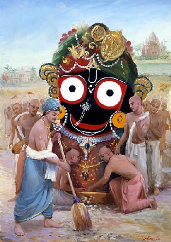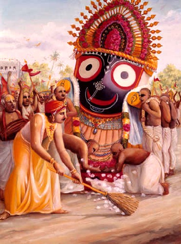 Enquanto o Senhor permaneceu em Puri, milhares de Seus devotos costumavam vir vê-Lo durante o festival dos carros do Senhor Jagannatha, Ratha-yatra. E durante o festival dos carros, a lavagem do templo Gundicha sob a supervisão do Senhor era uma função muito importante. O movimento sankirtana congregacional do Senhor em Puri era uma exibição única para a massa de pessoas. Assim é o meio para direcionar a mente da massa para a realização espiritual. O Senhor inaugurou esse sistema de sankirtana de massa, e os líderes de todos os países podem aproveitar esse movimento espiritual a fim de manter a massa de pessoas num estado puro de paz e fraternidade um com o outro. Essa é a demanda atual da presente sociedade humana em todo o mundo.