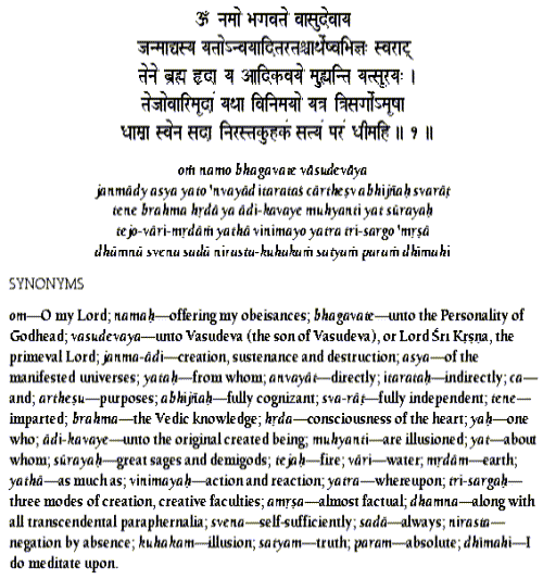 Verso 1 om namo bhagavate vasudevaya Tradução Ó meu Senhor, Sri Krishna, filho de Vasudeva, ó Personalidade de Deus todo-penetrante, eu ofereço minhas respeitosas reverências a Você. Eu medito no Senhor Sri Krishna porque Ele é a Verdade Absoluta e a causa primordial de todas as causas da criação, sustentação e destruição dos universos manifestos. Ele é consciente direta e indiretamente de todas as manifestações, e Ele é independente porque não existe nenhuma outra causa além Dele. Foi Ele quem primeiro concedeu o conhecimento Védico ao coração de Brahmaji, o ser vivo original. Por Ele, mesmo grandes sábios e semideuses são postos em ilusão, da mesma forma como alguém fica confuso pelas representações ilusórias de água vista no fogo, ou de terra vista na água. Somente por causa Dele, os universos materiais, temporariamente manifestos pelas reações dos três modos da natureza, parecem reais, apesar de irreais. Portanto, eu medito Nele, Senhor Sri Krishna, que é eternamente existente na morada transcendental, que é para sempre livre de todas as representações ilusórias do mundo material. Eu medito Nele, porque Ele é a Verdade Absoluta.